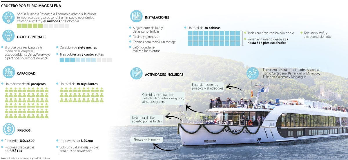 Lo primero, según explicó, es que se trata un crucero de lujo que navegará por el río Magdalena, visitando varias ciudades como Cartagena, Barranquilla, Mompox, El Banco, Calamar, Magangué, Santa Bárbara de Pinto, Nueva Venecia y Palenque. Este cuenta con tres cubiertas y cuatro suites, con capacidad para 60 personas y 40 tripulantes. Todas ellas dispondrán de aire acondicionado, televisión y wifi, además de un balcón doble. “Es un alojamiento de lujo con vistas panorámicas”, expresa Tirado.