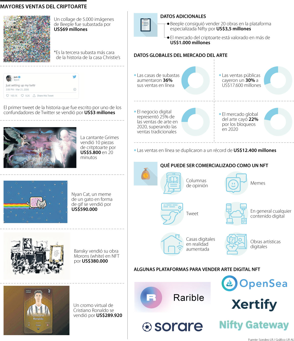 Por ejemplo, una de las obras digitales más caras es la del artista Beeple, llamada ‘Todos los días: los primeros 5.000 días’ un collage de 5.000 imágenes que el artista recogió a lo largo de los últimos 13 años. Esta fue ofertada por la casa de subastas Christie’s por más de US$69 millones.