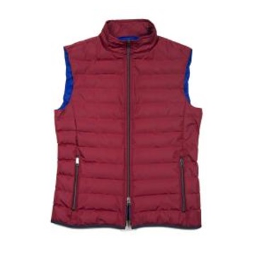 Chaleco impermeable de la marca italiana Etro, color vinotinto y contrastado con azul intenso. $1,7 millones: