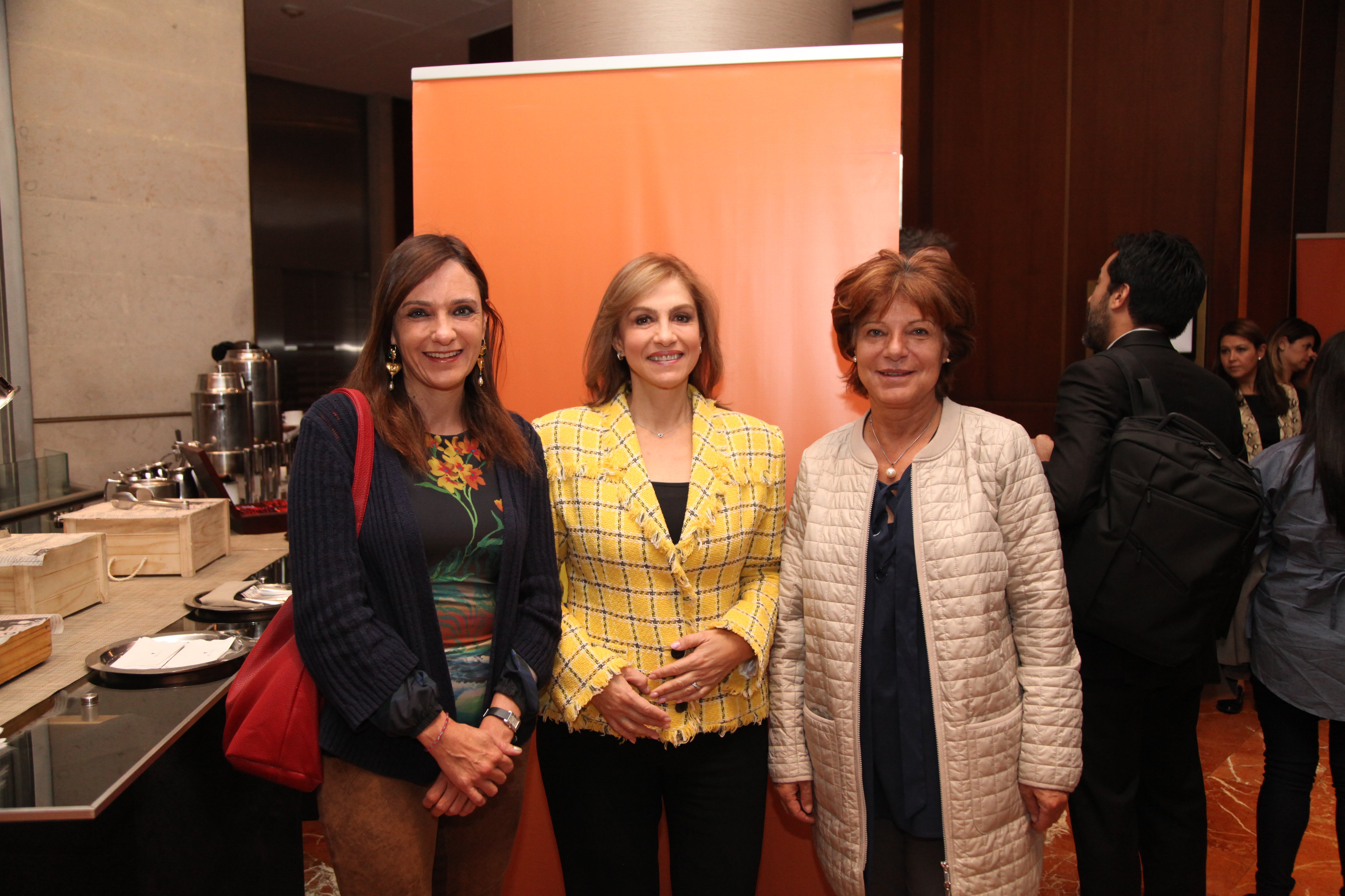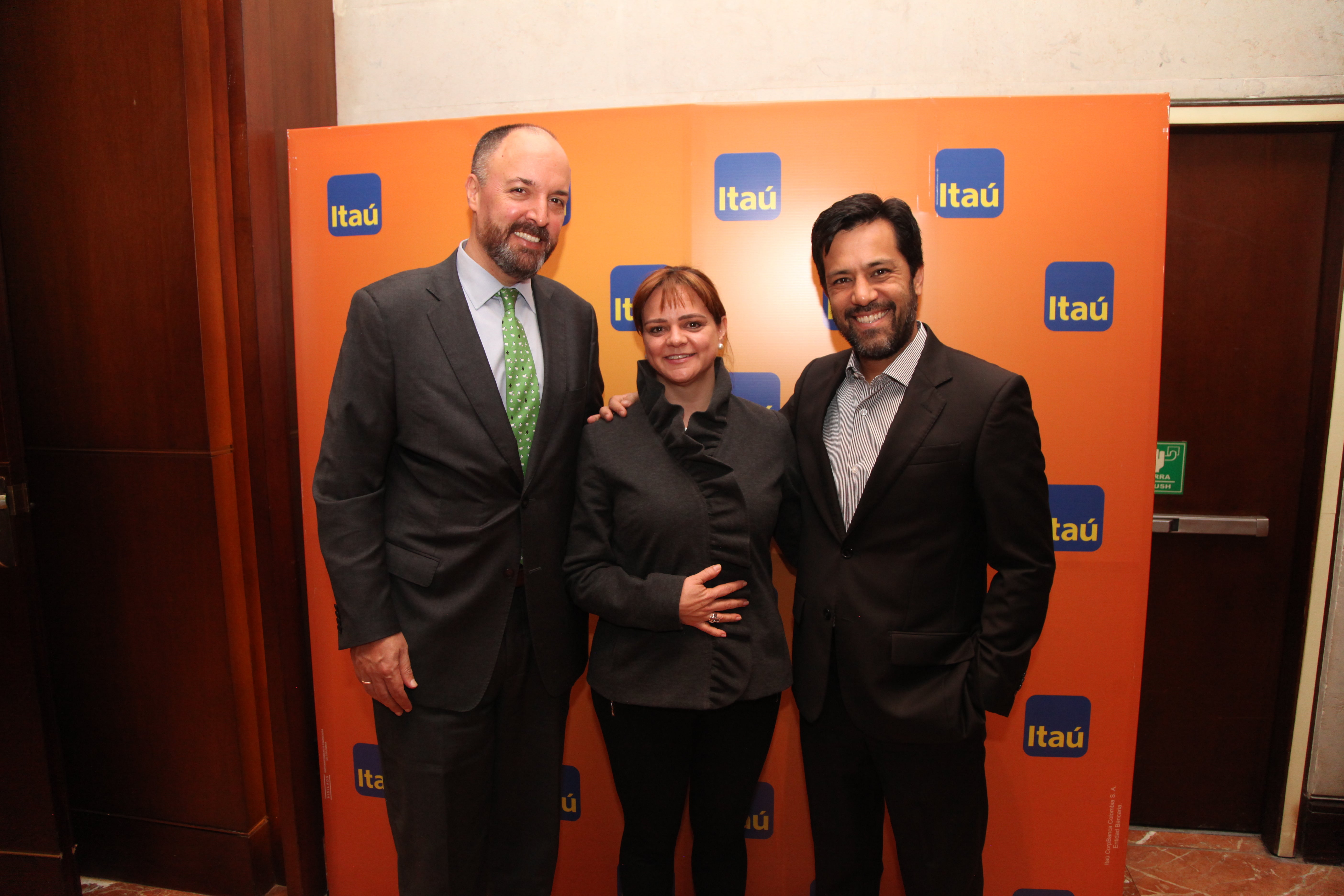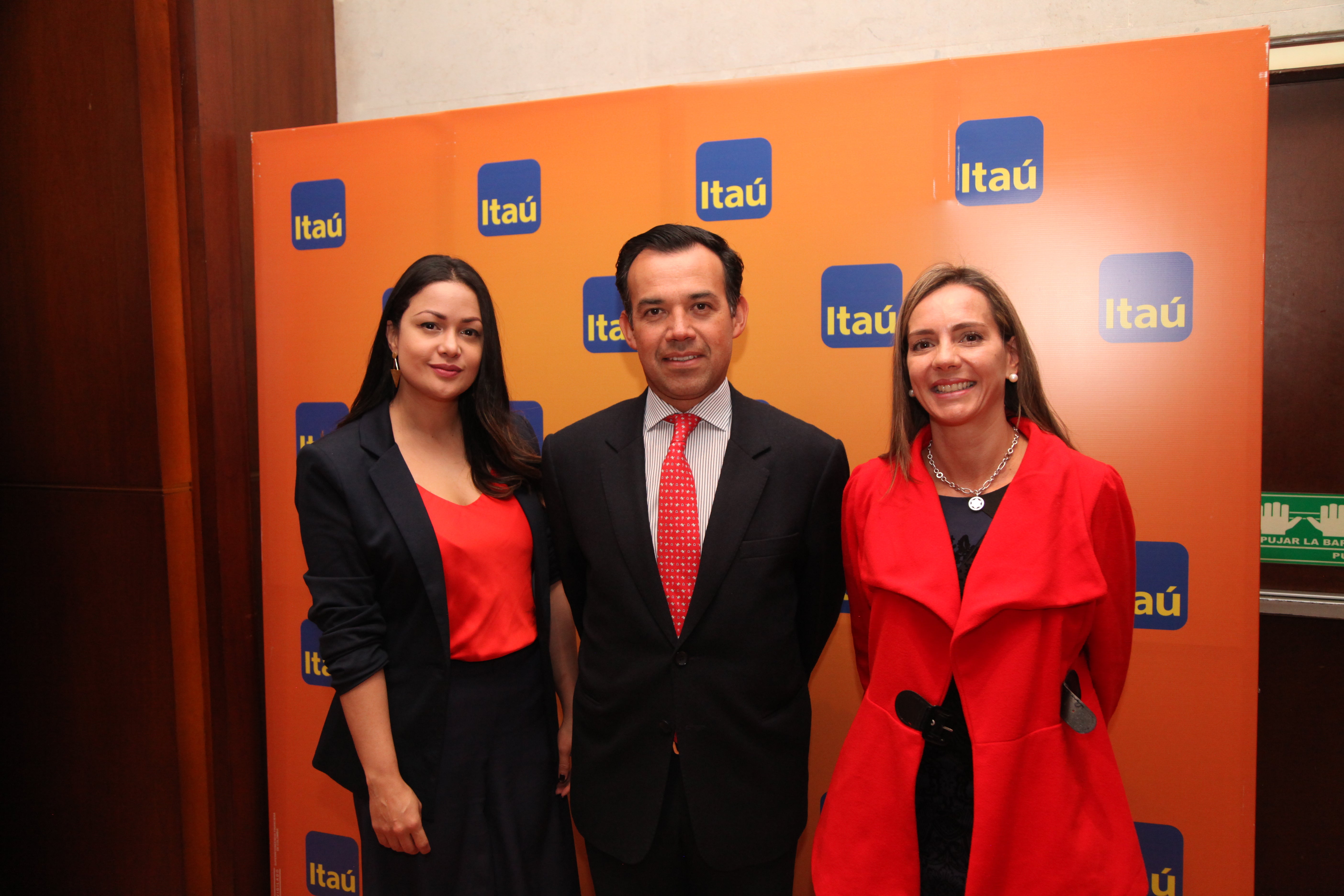 Carolina Escalante, jefe de mesa corporativa de Itaú; acompañada de Edwin González, gerente de inversiones de Itaú Asset Management; y Camila Vásquez, gerente de Itaú Asset Management.