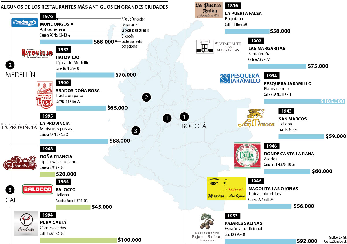 Estos y otros establecimientos creados antes de 1950, como la trattoria San Marcos que ofrece pasta fresca y panadería a artesanal y Donde canta la rana, se pueden visitar en Bogotá con costos cómodos, en el caso del segundo restaurante sus bandejas cuestan $30.000.