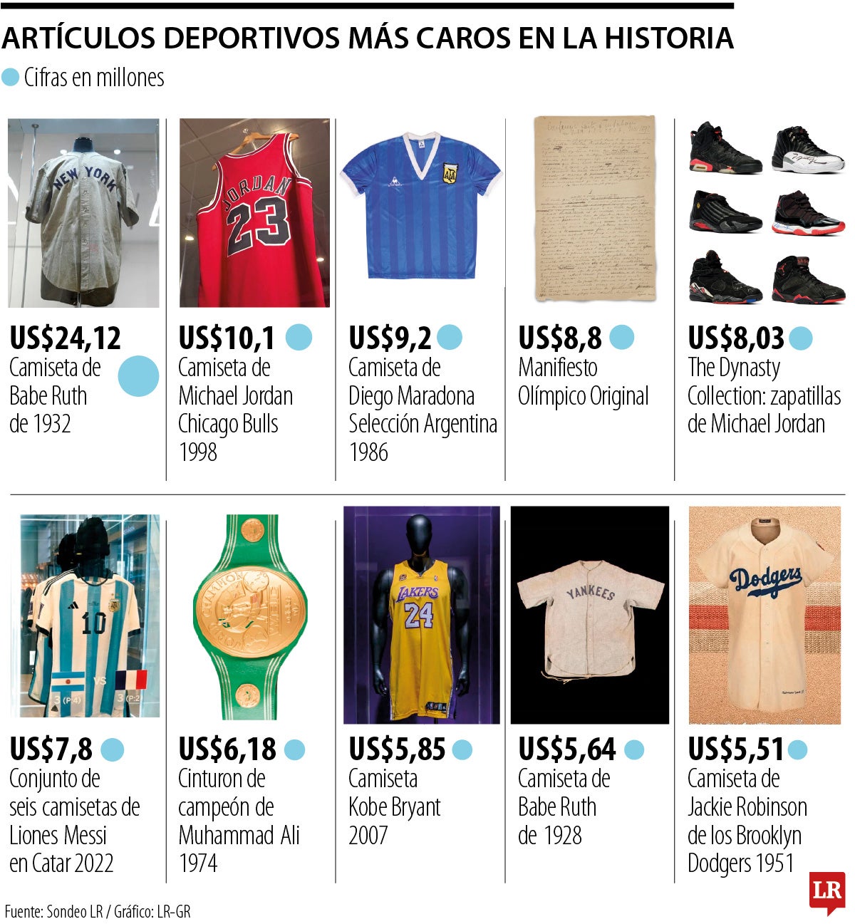 El primer puesto se lo lleva la camiseta de la leyenda del béisbol, Babe Ruth, que uso cuando en 1932 ganó la serie mundial con los Yankees de Nueva York. Esta se vendió por US$24,12 millones en una subasta reciente de Heritage Auctions en agosto de este año.