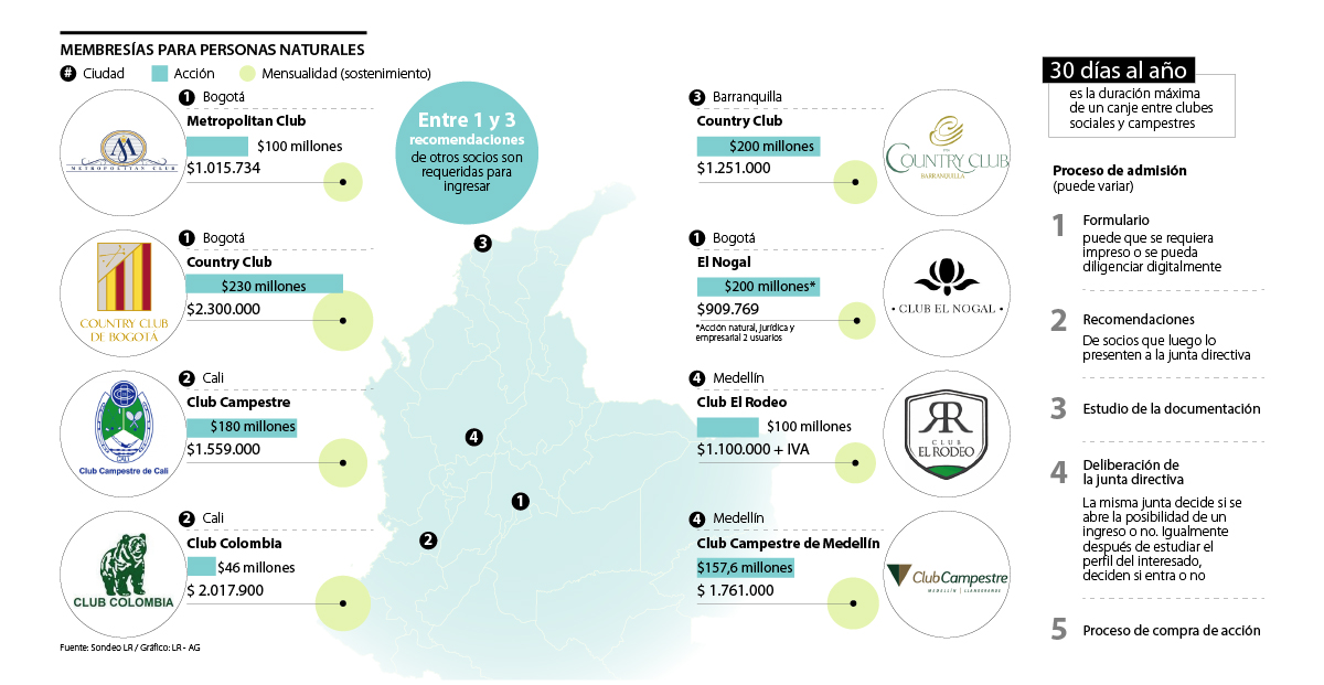 En Cali, el Club Colombia tiene una cuota de admisión de $30 millones, más $16 millones por el proceso, para un total de $46 millones. Si es para una persona jurídica, el costo de la membresía es de $21 millones.