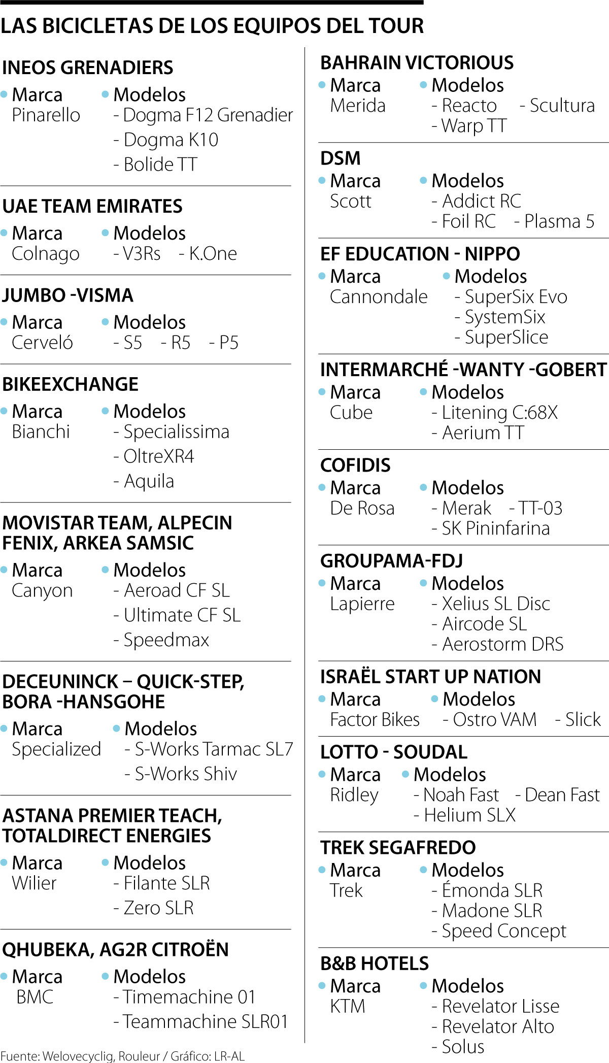 Son 18 las marcas que van a estar corriendo en terreno francés, pero las principales por su renombre a lo largo de los años son: Pinarello, Colnago, Cervélo, Bianchi, Trek y Specialized.