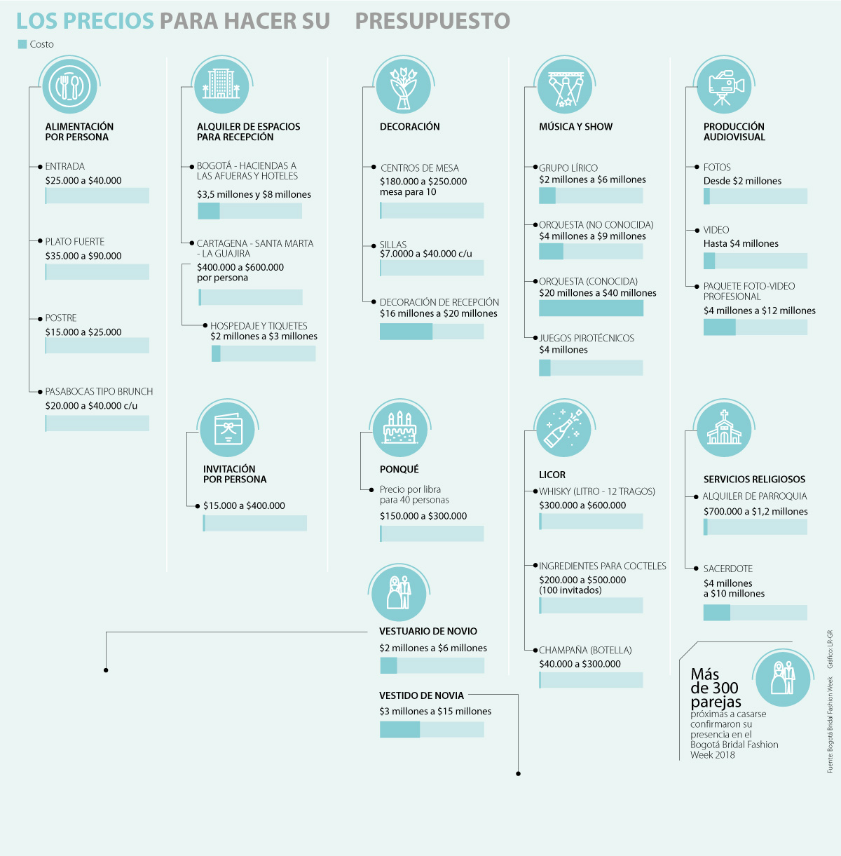 Pues como bien se dice el día de la boda puede ser el más caro de su vida, teniendo en cuenta que el vestido de novia puede costar $15 millones; el traje del novio $6 millones; la alimentación cerca de 20 millones; la decoración con centros de mesa $2,5 millones y las invitaciones $4 millones (ver gráfico).