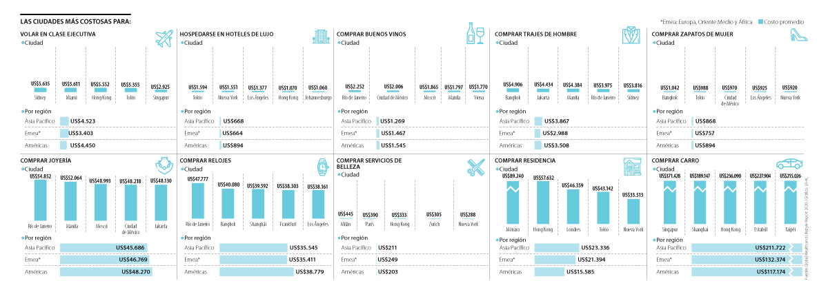 Para temas de moda y belleza en hombres, las ciudades más exclusivas para comprar trajes son Bangkok y Yakarta, con precios cercanos a US$4.906 y US$4.434; respectivamente. Para zapatos de mujeres, Bangkok también lidera el top cinco con precios promedio de US$1.042, seguida de Tokio en US$988 y cierran las cinco Ciudad de México, Los Ángeles y Nueva York.
