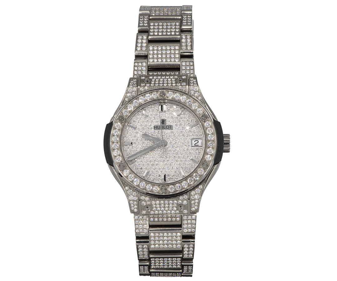 La caja y el bisel del reloj Hublot Classic Fusion Titanium Full Pavé 45mm están engastadas (cubierta) con un total de 344 diamantes. La esfera es de oro blanco de 18 quilates y engastada con 609 diamantes, excepto por los marcadores de hora. La pulsera de titanio satinada cuenta con 1.044 diamantes.