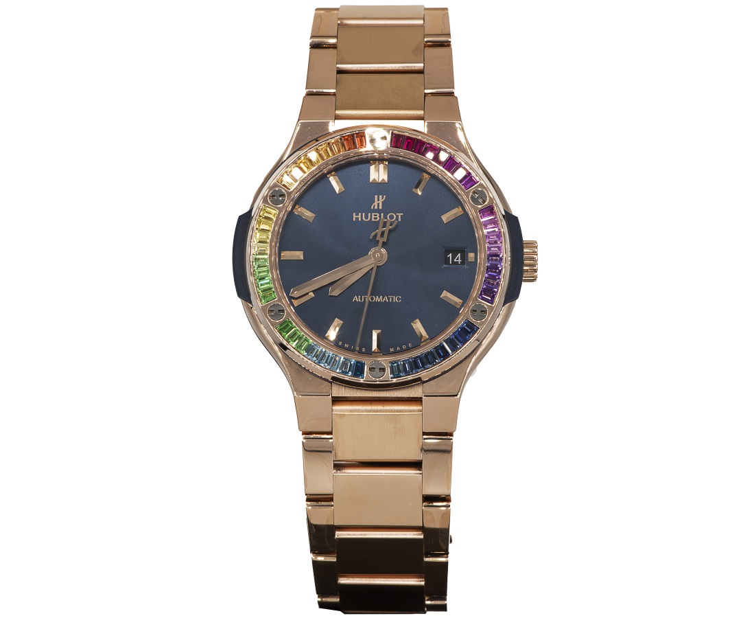 El diseño único del Hublot Classic King Gold Fussion Rainbow viene con un tablero oscuro que contrasta con las piedras preciosas que componen los siete colores del arcoiris y están engastadas en la esfera del reloj. Es un regalo ideal para mujeres que se atreven a innovar y cambiar su estilo con una pieza de $211,6 millones.