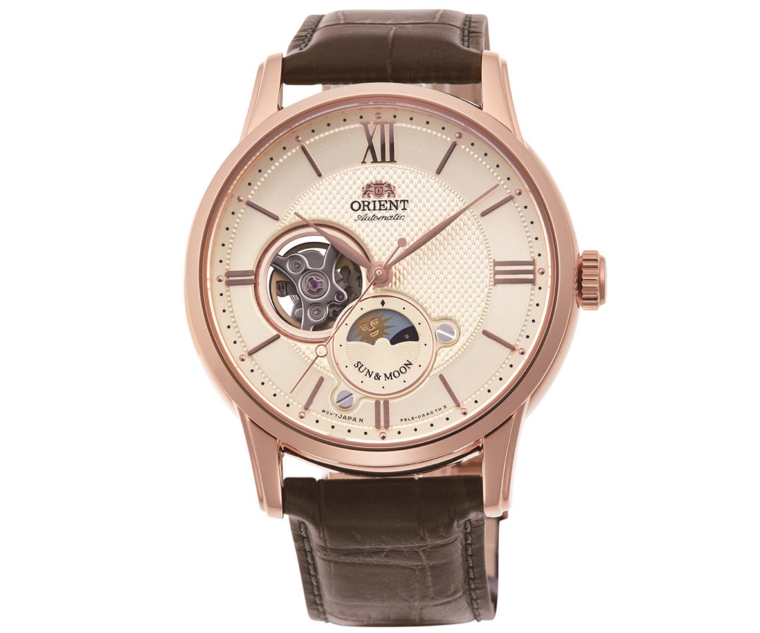 Un reloj mecánico clásico de 40,5mm combina los detalles del open heart y el sun & moon. La sub-esfera indica día y noche, enmarcada en una caja de acero inoxidable color oro rosa, con un cristal zafirado curvado. Correa de cuero, los índices en números romanos y las manecillas en forma de hoja en oro rosa.