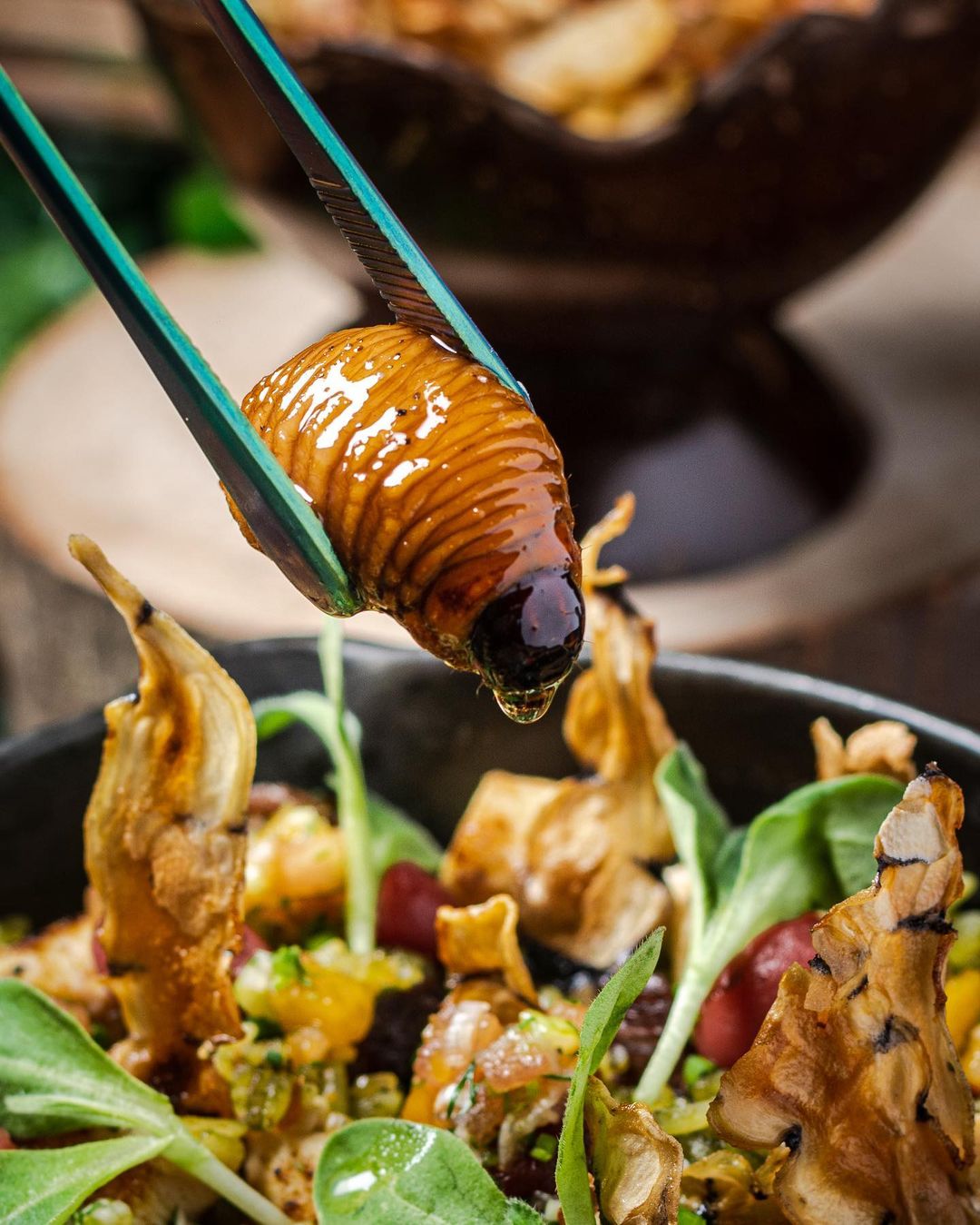 Arroz en denominación de origen colombiano. Trae trozos de pechuga asada, costillas de res asada, carne de cerdo, chorizo, mojo de tomate y cebolla con chips de cubios en mantequilla. Junto a este se puede arriesgar a probar los gusanos amazónicos. $55.000