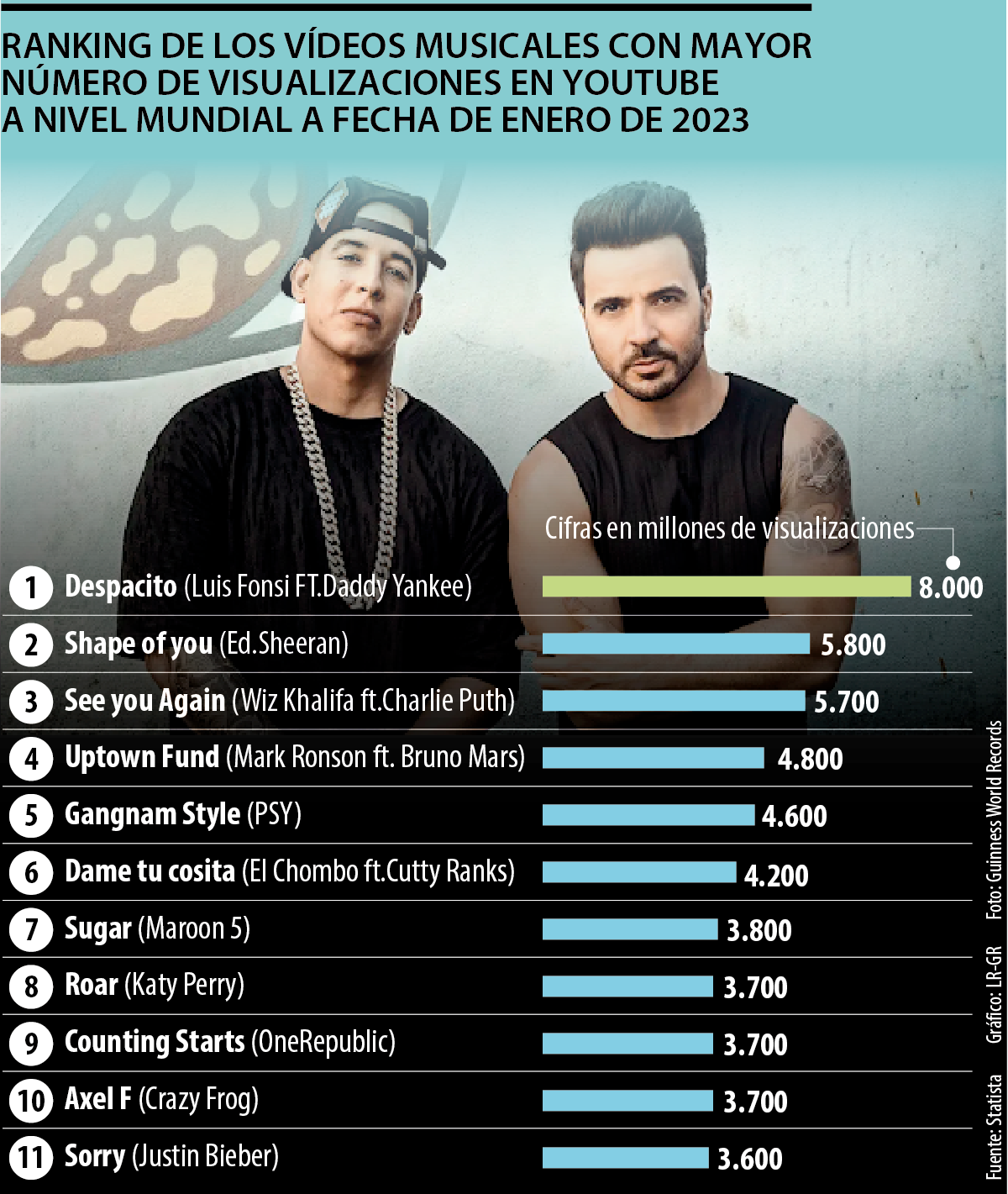 El recorrido por cada uno de estos videos empieza con dos puertorriqueños liderando el ranking, uno de ellos es Daddy Yankee que junto a Luis Fonsi lograron hacer el vídeo con mayor número de visualizaciones en YouTube a nivel mundial. El video de la canción 'Despacito' logró 8.000 millones de vistas. Este fue grabado en el barrio La Perla del Viejo San Juan, Puerto Rico. Allí se alcanza a observar algo de la cultura del lugar y paisajes impresionantes del mar.