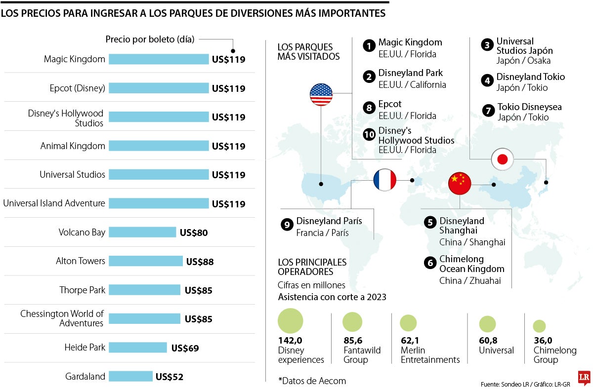 Según las cifras del Índice Temático y de Museos, en 2023 los principales parques de diversiones recibieron más de 512 millones de asistentes. Este ranking destaca que el principal operador mundial es Disney, seguido por Fantawild Group que es un holding chino, y en tercer lugar aparece Merlin Entretainments Group que está en Europa, principalmente en Inglaterra y otras naciones del Reino Unido.
