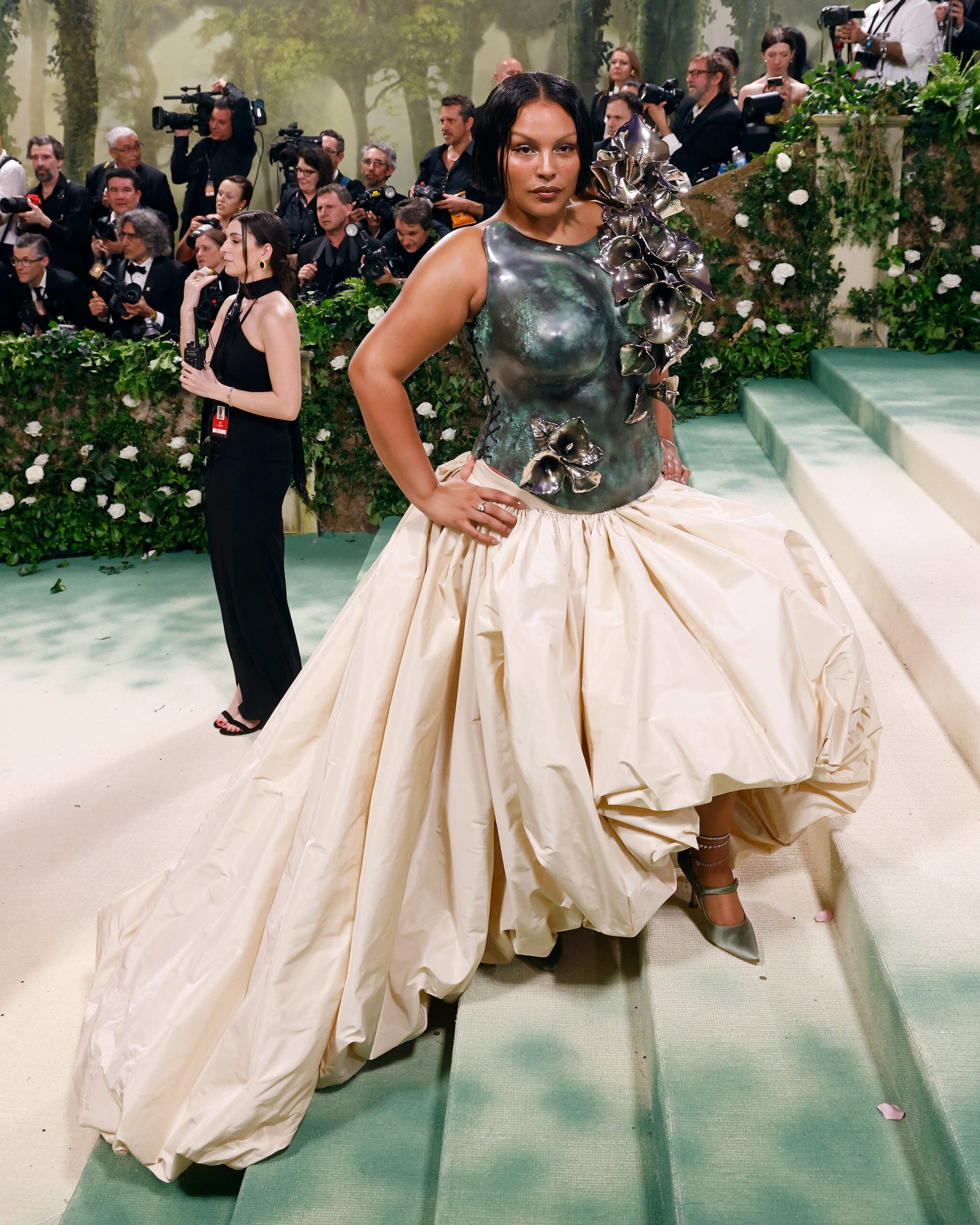 Lució un traje de dos piezas con significado escultural. En la parte superior consta de un corpiño de metal diseñado a la medida, impreso en 3D y electroformado en verde oxidado. Fue fabricado en Los Ángeles por Michael Schmidt Studios, está adornado con flores de alcatraz impresas en 3D. El corpiño está combinado con una falda de tafetán de seda champán con dobladillo abullonado.