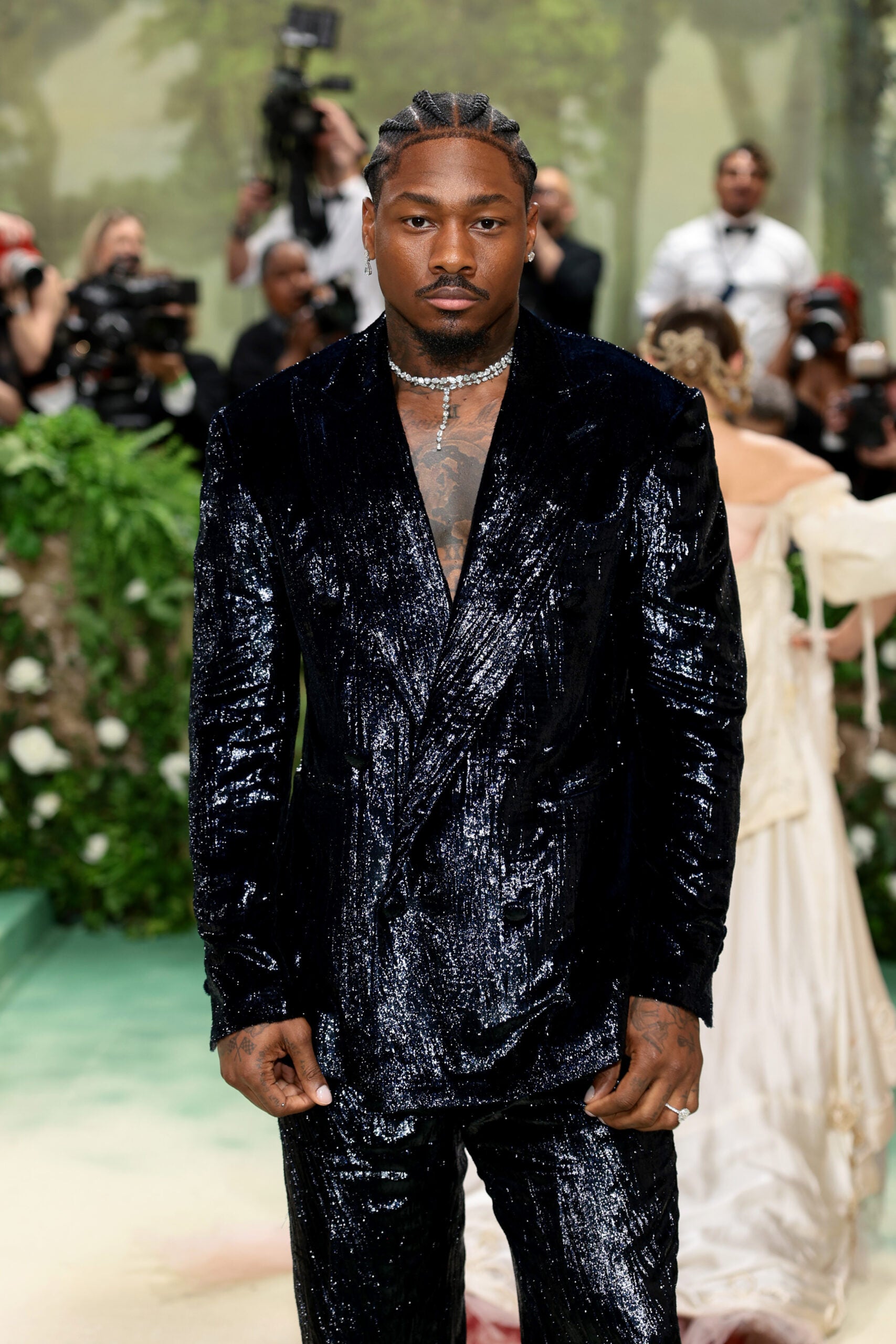 Portó un traje que ejemplifica la sastrería con toque relajado, "el cual estaba compuesto por una chaqueta cruzada con hombros marcados y solapas exageradas combinadas con pantalones anchos en terciopelo azul medianoche con lurex para crear una calidad fluida, con una V profunda que deja al descubierto su pecho", concluye H&M.