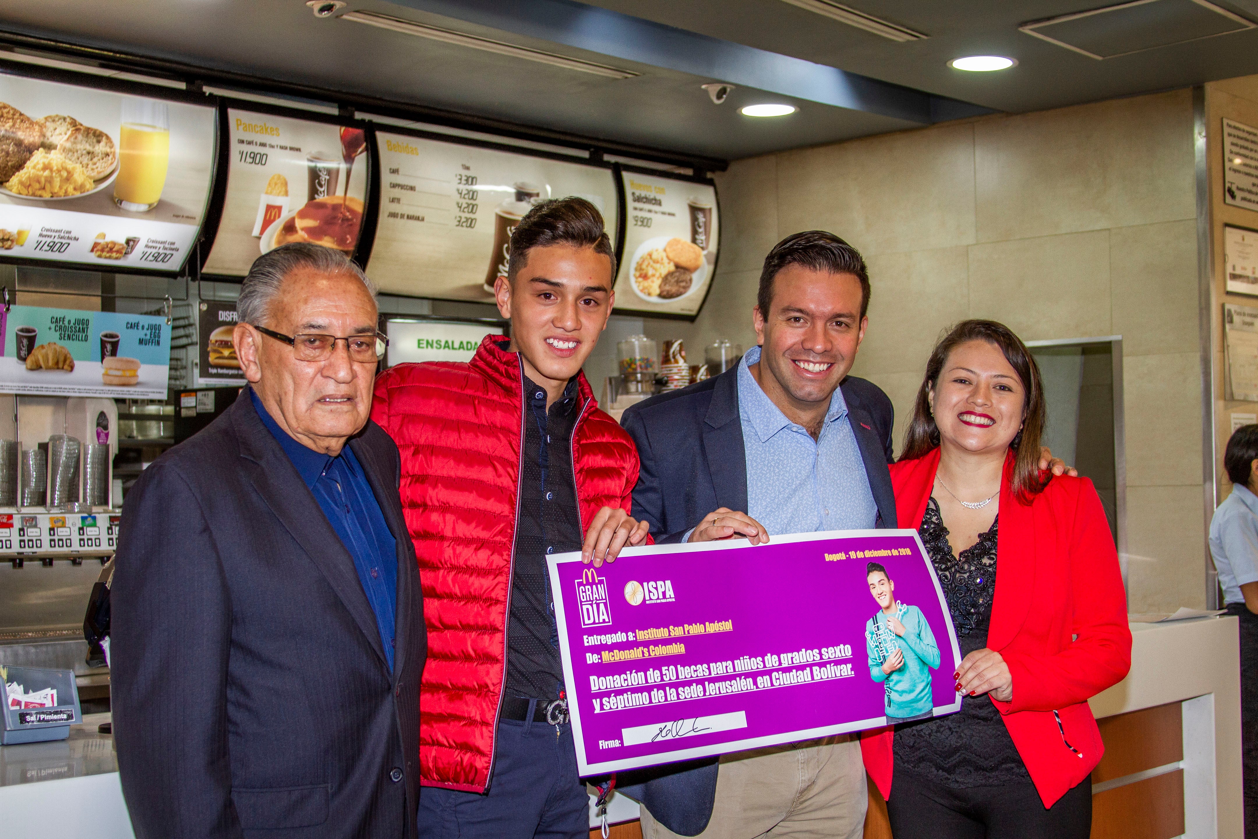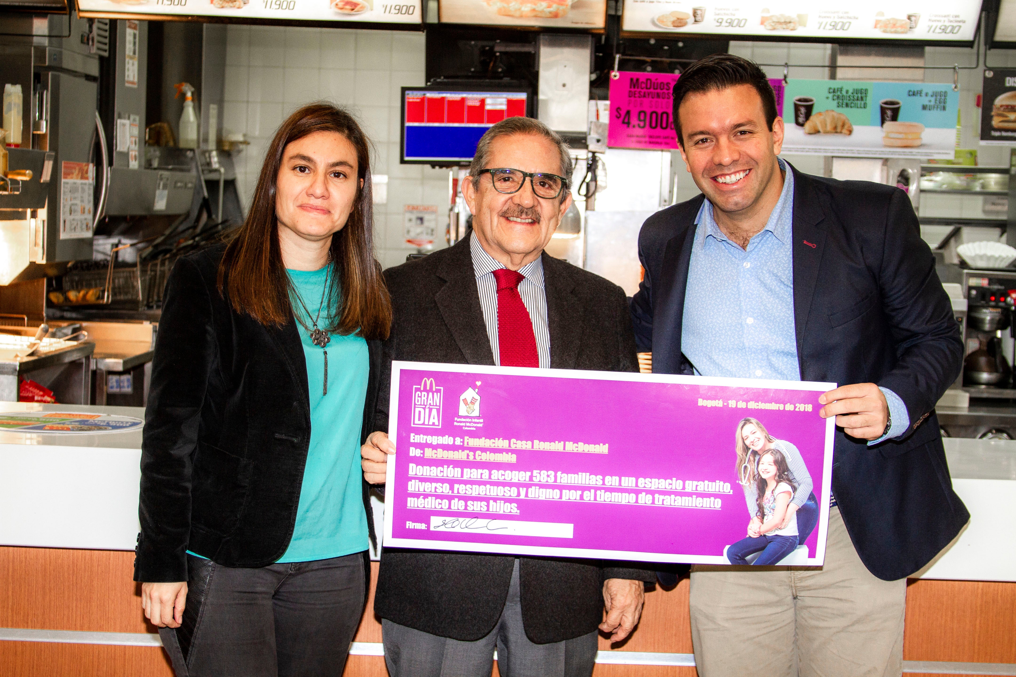 La cadena de restaurantes McDonald’s hizo entrega oficial de la donación con la cual 50 jóvenes de Ciudad Bolívar serán becados en el Instituto San Pablo Apóstol y más de 580 familias tendrán acceso a los espacios gratuitos que ofrece la Fundación Casa Ronald, durante el tiempo del tratamiento médico de sus hijos. En la foto: Renata Ángel, dir. de Desarrollo de la Fundación Casa Ronald McDonald; José María Forero, miembro de la junta directiva de la Fundación; y Héctor Orozco, dir. de Operaciones de Arcos Dorados.