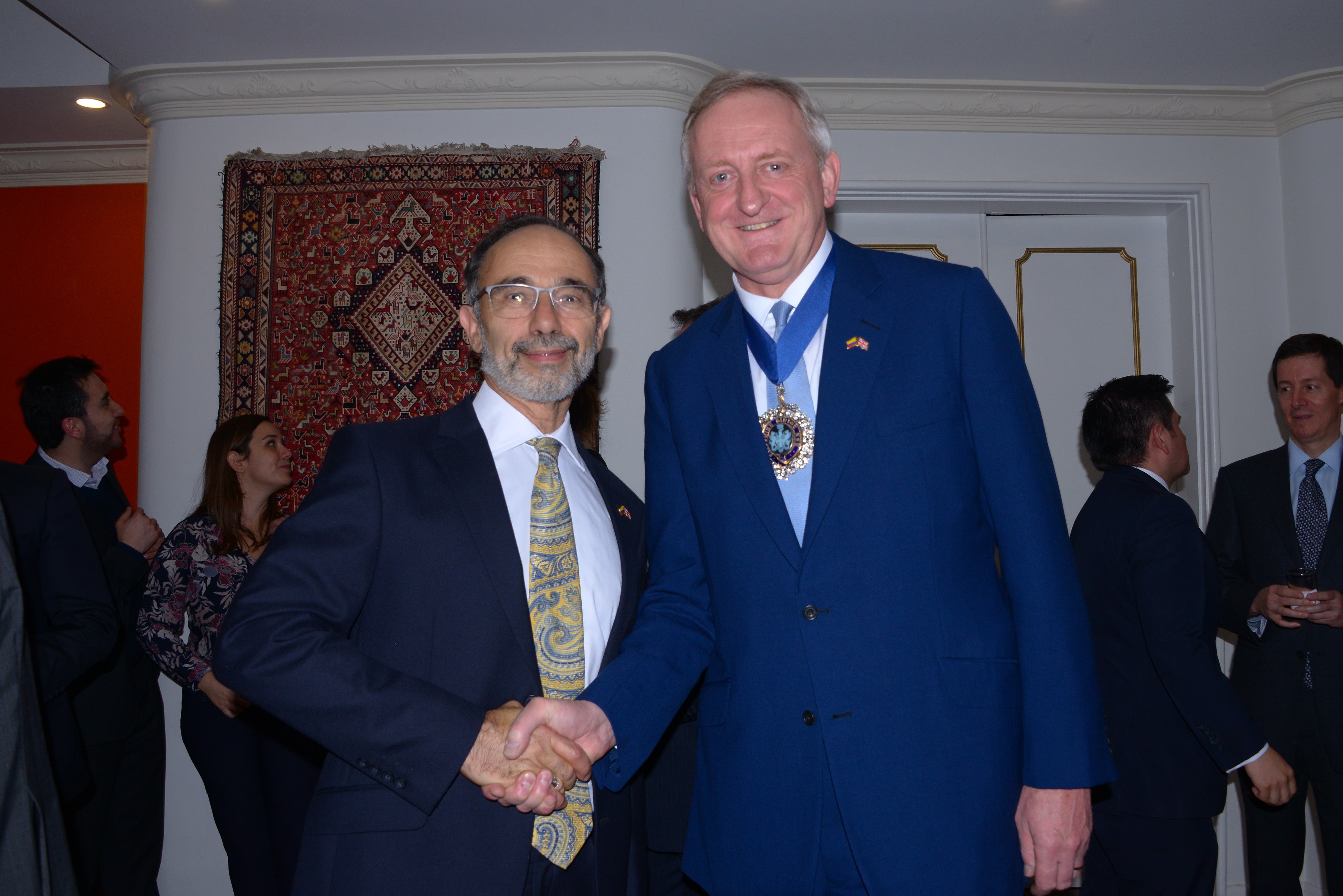 El Lord Mayor de Londres, Peter Estlin, visitó Colombia, donde se reunió con representantes de la Embajada Británica, miembros del Gobierno Nacional y directivos de diversos sectores, incluyendo el financiero, para promover al Reino Unido como aliado estratégico. La gira de Estlin también sirvió para entregar un reconocimiento de Mansion House a un colombiano. En la foto: Peter Tibber, embajador de Reino Unido en Colombia, acompañado de Peter Estlin, Lord Mayor de Londres.