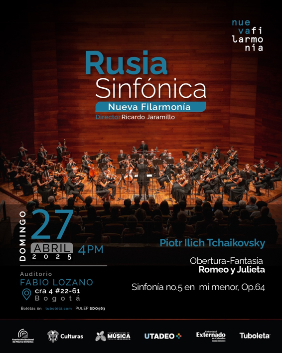 La Nueva Filarmonía continúa su ciclo 2025 ‘Rusia Sinfónica’ con un concierto este domingo 27 de abril en el Auditorio Fabio Tadeo Lozano. Bajo la dirección del maestro Ricardo Jaramillo, se interpretarán la Obertura-Fantasía Romeo y Julieta y la Sinfonía No. 5 de Tchaikovsky. Este ciclo resalta el nacionalismo musical ruso y la creación colombiana contemporánea.