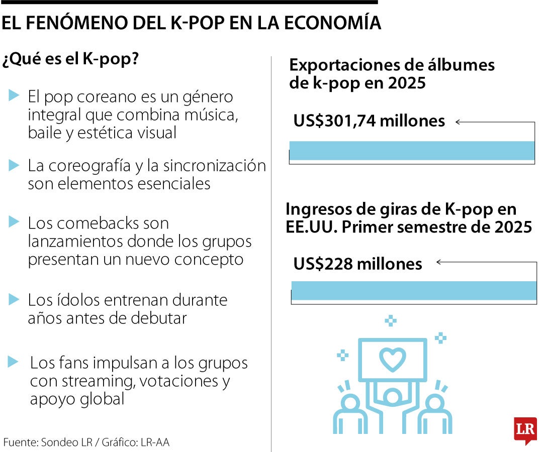 Según una encuesta realizada por el Ministerio de Cultura, Deportes y Turismo de Corea y la Fundación Coreana para el Intercambio, el K-pop sigue siendo la imagen más reconocida por los extranjeros cuando piensan en la cultura coreana. A esto se suma que en 2025 la industria alcanzó su volumen más alto de exportaciones totales de música coreana, con US$301,74 millones.