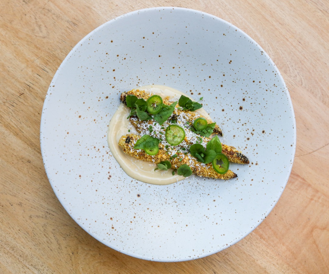 Esta es una entrada perfecta para los vegetarianos o para quienes prefieran los vegetales. Las mazorcas están acompañadas de queso costeño, jalapeño, mayonesa de mantequilla avellanada.