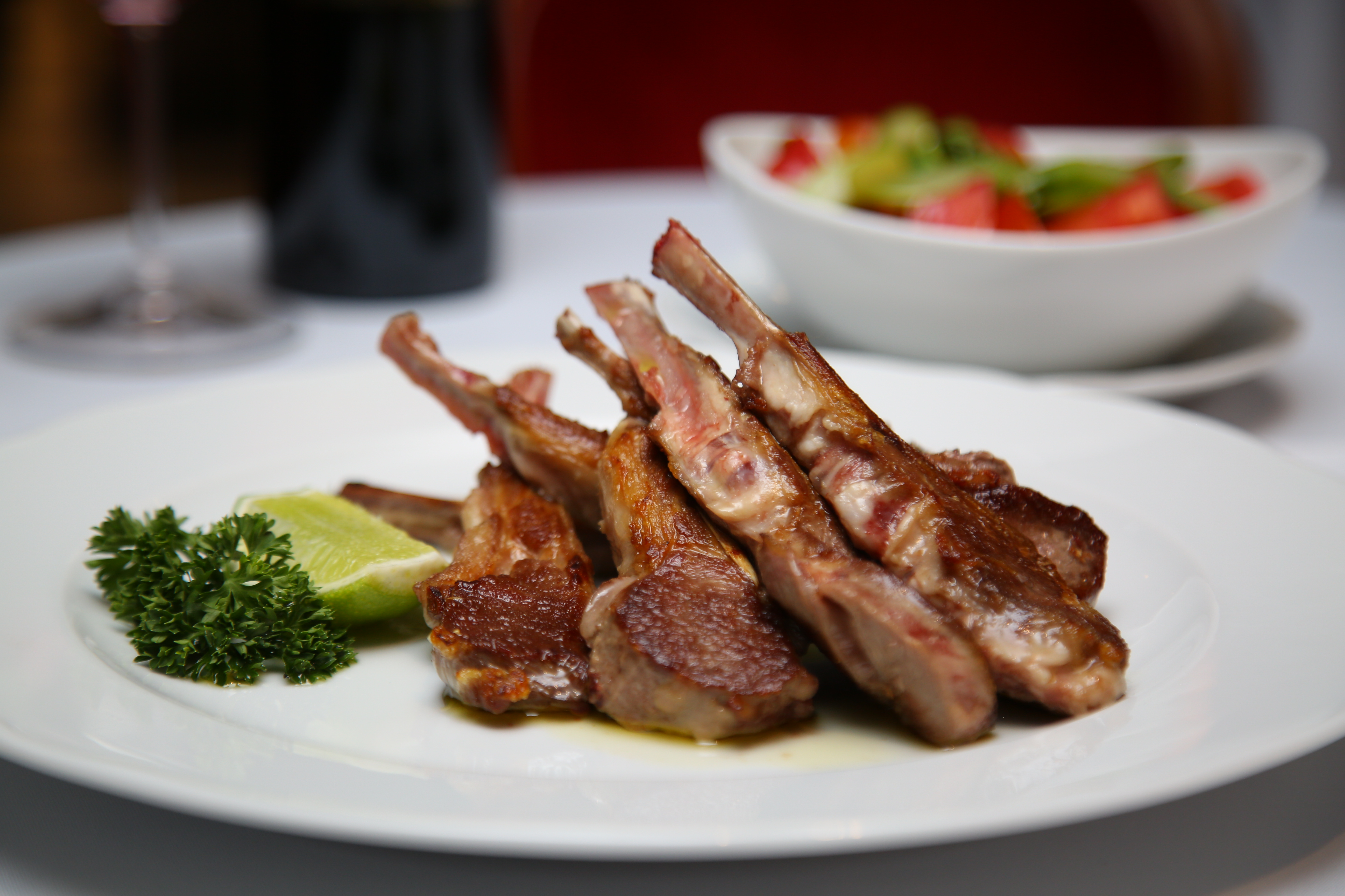 Jugosa chuleta de cordero a la parrilla, acompañada ensalada verde mixta.