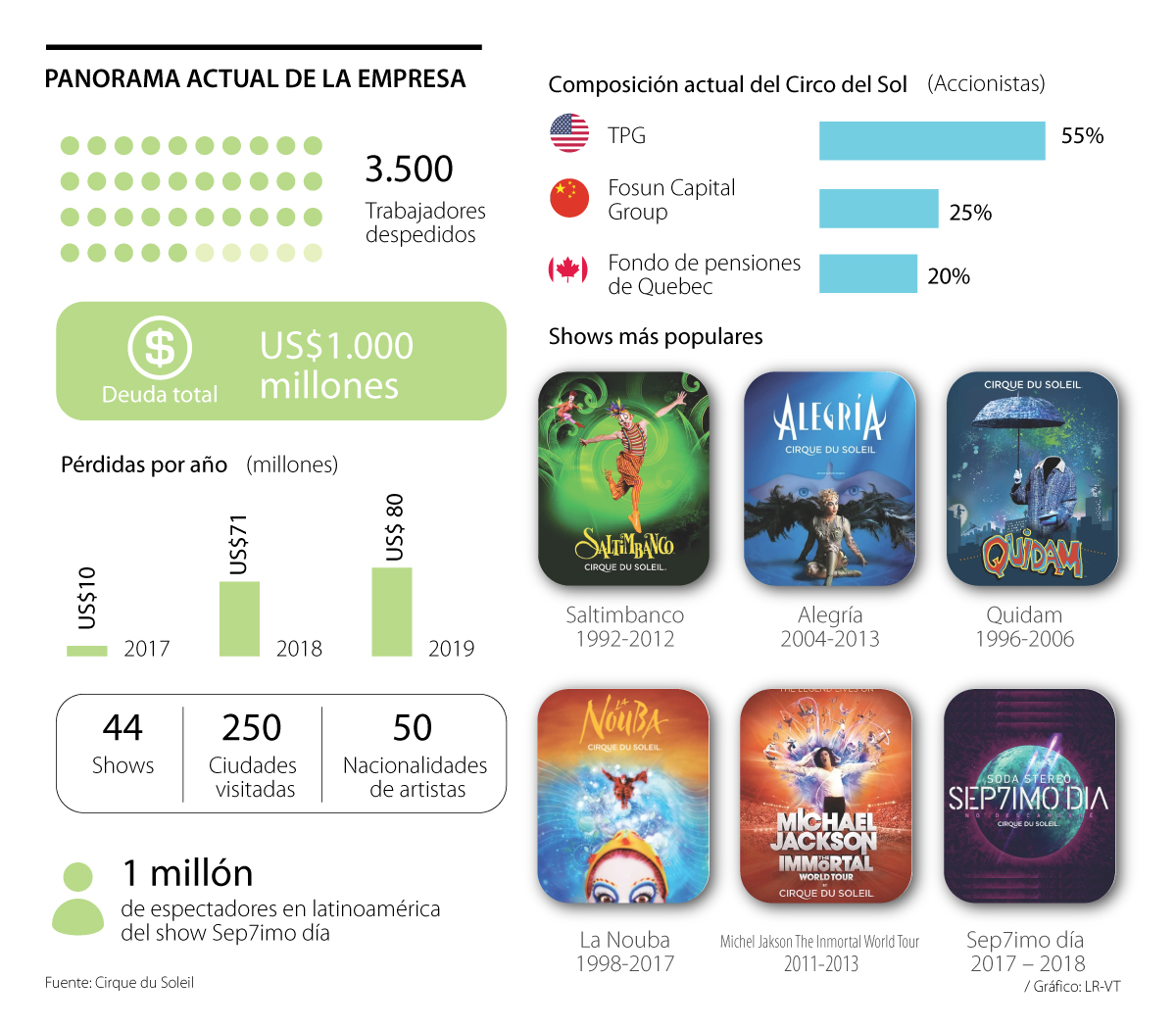 A esto se suma que, si bien la empresa mantiene su base en Montreal, desde 2015, cuando su cofundador Guy Laliberté vendió su participación accionaria por más de US$1.500 millones, los propietarios de la carpa son el grupo estadounidense TPG (55%), Fosun Capital Group de China (25%) y el Fondo de pensiones de Quebec (20%).
