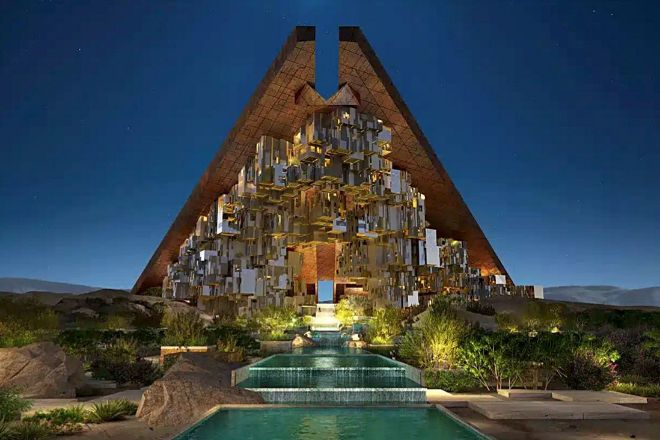 El proyecto faraónico de Neom se encuentra en el noroeste de Arabia Saudita y presenta uno de sus edificios más espectaculares visto hasta ahora: el Monolito de Gidori, una gran estructura triangular que sale de la tierra hacia el cielo y que se inspira en las formaciones rocosas del desierto.