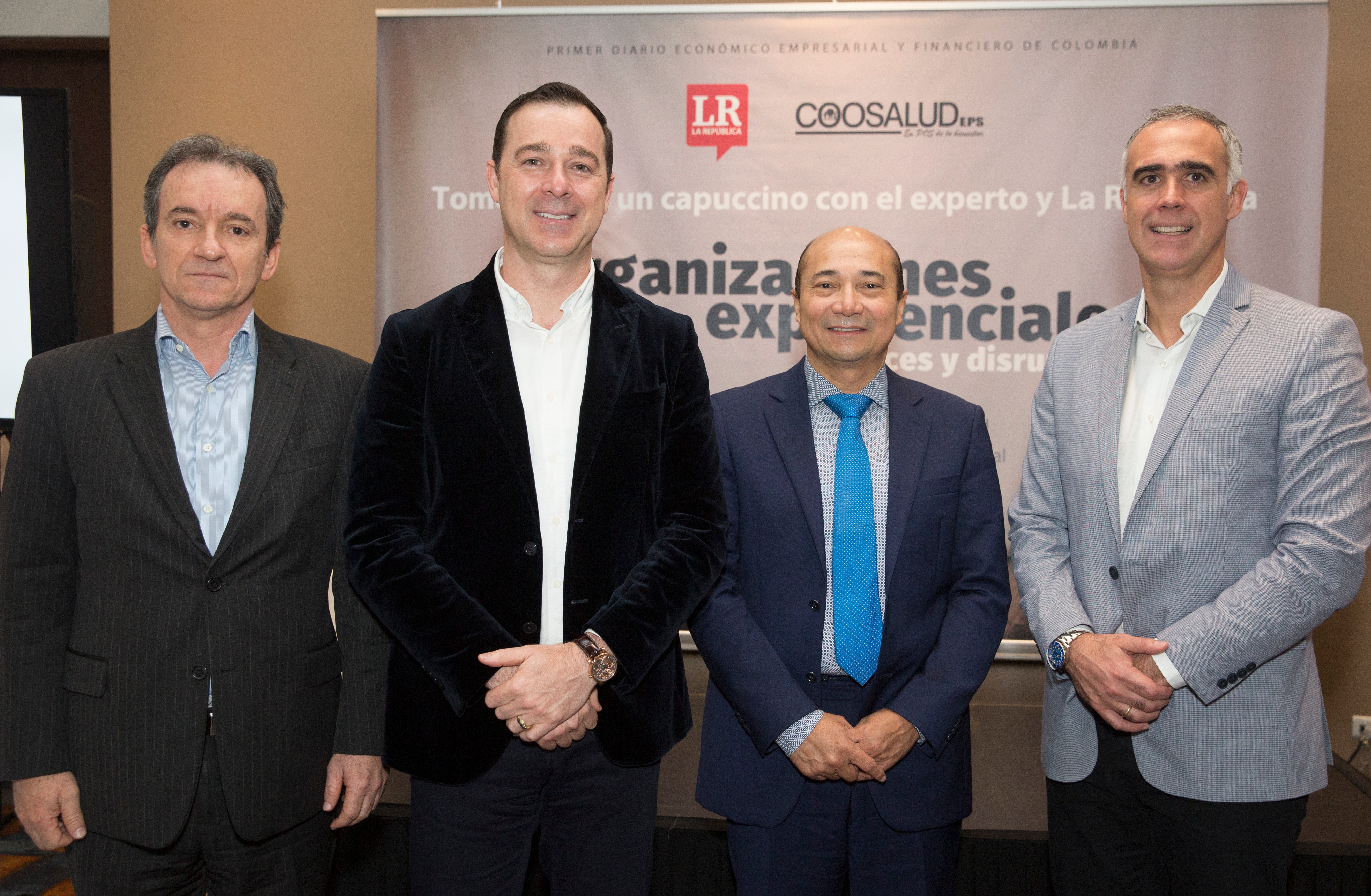El Diario La República y Coosalud realizaron en Medellín el evento Un capuchino con el experto en el ciclo de conferencias: “Organizaciones exponenciales, veloces y disruptivas”. En esta oportunidad se habló sobre los retos digitales, el Internet de las Cosas y la Inteligencia Artificial. En la foto: Carlos Quijano, director ejecutivo de Amcham Antioquia & Caldas; Marco Casarín, director general de Microsoft Colombia; Jaime González, presidente de Coosalud; y Marcelo Cataldo, presidente de TigoUne.