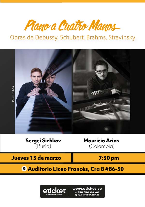 El próximo 13 de marzo se llevará a cabo, el concierto de música clásica ‘Piano a cuatro manos’. Interpretado por el reconocido pianista ruso Sergei Sichkov y el colombiano Mauricio Arias. Los artistas tocarán piezas icónicas de su mismo repertorio en el que el piano se convertirá en el eje del show, logrando una sincronización llena de armonía y complicidad.