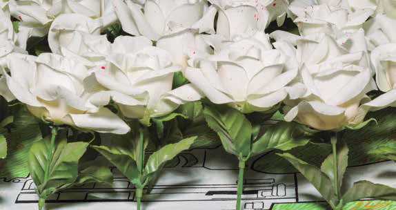Esta pieza de arte de rosas artificiales y óleo sobre lienzo de 122 cm x 61 cm x 17 cm busca representar los muertos de la guerra. Sin embargo, desde lejos y a la distancia todo es tan armónico que usted recibirá el mensaje de que todo es bello.