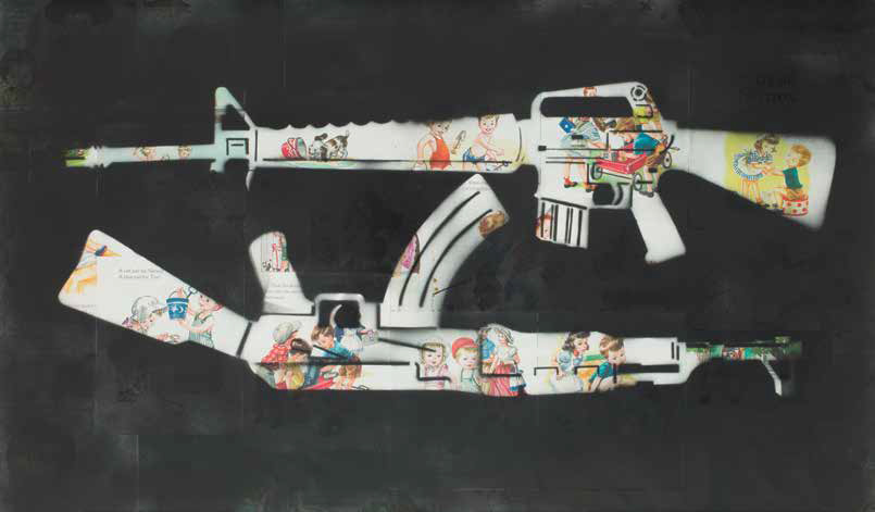 Es una pieza que está elaborada a partir de pintura en aerosol, cuentos infantiles sobre ‘foam board’ y mide 60 cm x 100 cm. Con esta, el artista busca poner a pensar en cuál ha sido el papel de los niños en la guerra, un tema que le duele y a diario lo hace cuestionarse acerca del porqué ha sucedido esto en el país.