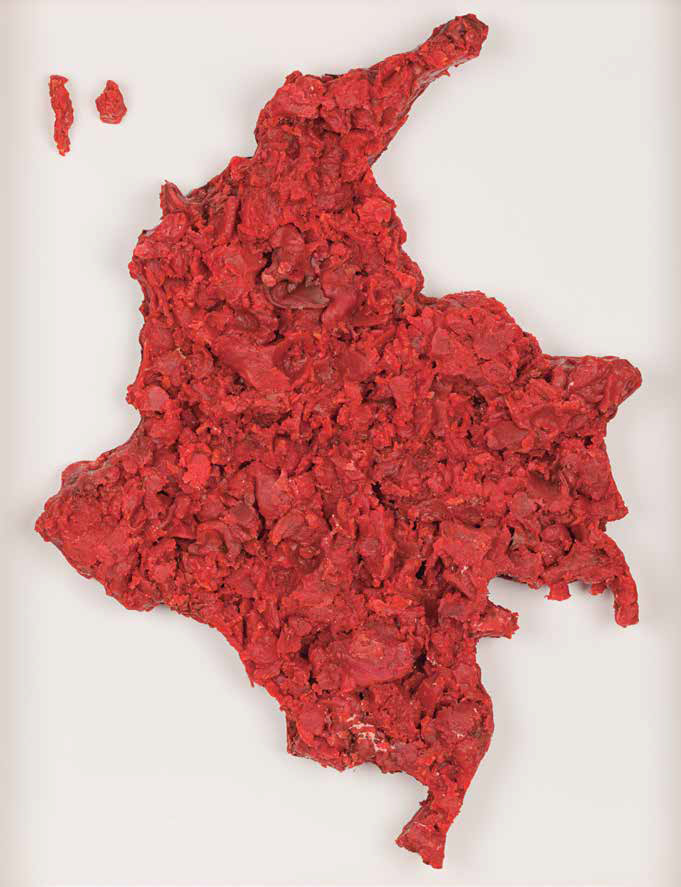Esta obra Colombia, 15 de abril de 2015: Mueren en La Esperanza está elaborada a partir de cera de abeja teñida de rojo sobre MDF y retrata el momento en que “Colombia amanece consternada en medio del proceso de paz y de la tregua decretada por las Farc”.