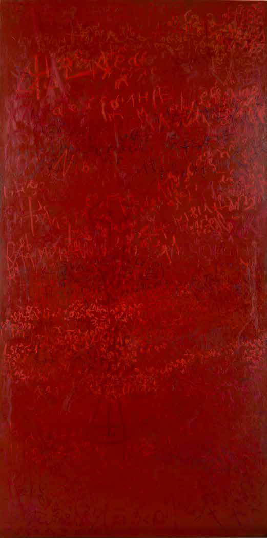 Esta pieza que hace parte de su exposición ‘Violentos Interiores’ está hecha a partir de óleo sobre lienzo y tiene 200 cm x 100 cm. En la obra se puede apreciar que sobre un fondo rojo están escritas varias letras, palabras o frases, que pueden conectarlo con el sufrimiento que dejó el conflicto.