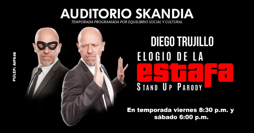 Diego Trujillo trae al Auditorio Skandia su monólogo-multimedia sobre la estafa. El sarcasmo y el humor crítico busca enmarcar la cultura colombiana. El show es un stand-up parody que invita a los espectadores a reírse de ellos mismos y de la idiosincrasia. Trujillo busca poner en tela de juicio la eterna condición de estafadores y estafados. Disponible desde el 14 de febrero.