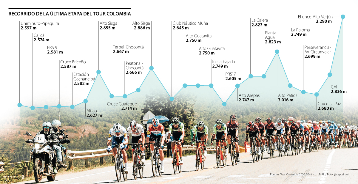 Viva en Bogotá la última etapa del Tour Colombia 2020. Con un total de seis jornadas, el sexto recorrido culminará en la capital del país el próximo domingo 16 de febrero. El título será disputado en un trayecto de 182,6 kilómetros desde Zipaquirá hasta El Once Verjón.