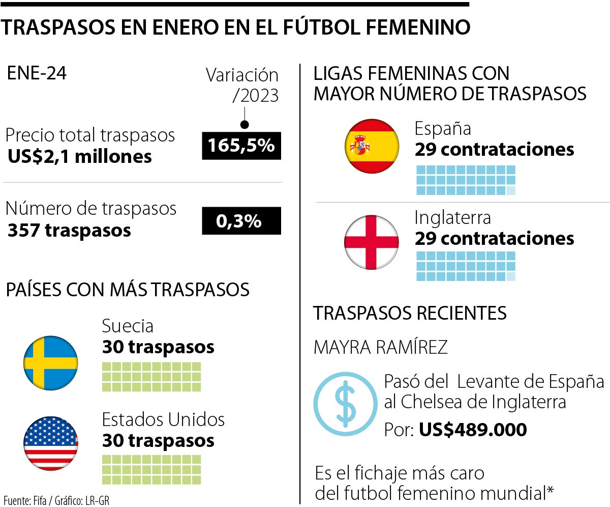 Las ligas femeninas que encabezaron la mayor cantidad de fichajes a nivel global fueron España e Inglaterra, cada una con 29 contrataciones; mientras que los países que traspasaron más jugadoras en el mercado de enero fueron Suecia y Estados Unidos, con 30 cada uno.
