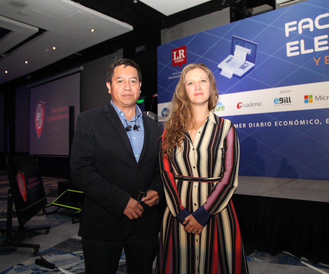 Los conferencistas Raúl Flores Palacios, experto en factura electrónica de Microsoft Colombia, y Viviana López, gerente legal de Procter & Gamble Colombia.
