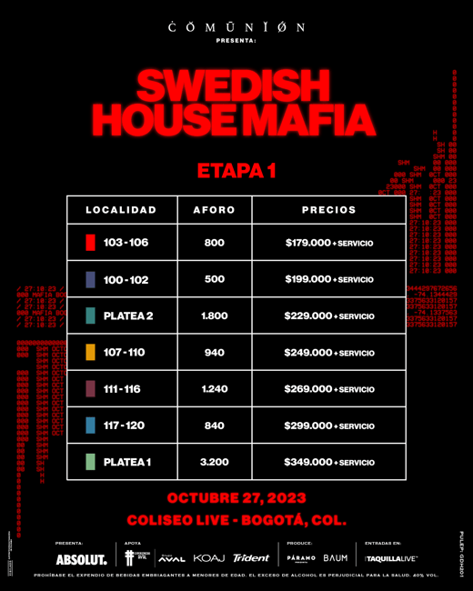 Swedish House Mafia convocó a los amantes de la electrónica para que asistan a su presentación en el Coliseo Live en Bogotá el 27 de octubre de este año, en donde la atención se la llevarán temas emblema como “Don´t You Worry Child” y "Redlight".