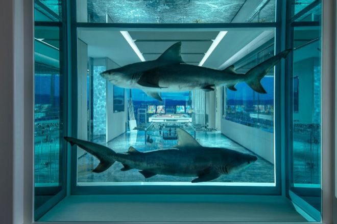Tiburones. Eso es lo que tiene esta suite. Sería posible comenzar describiendo la habitación de hotel más caro del mundo con cualquier otro de los detalles y objetos que pueblan los 800 metros cuadrados. Pero pocos impactan más que los dos ejemplares de escualos que se mantienen inmóviles en una vitrina al lado de un futbolín.