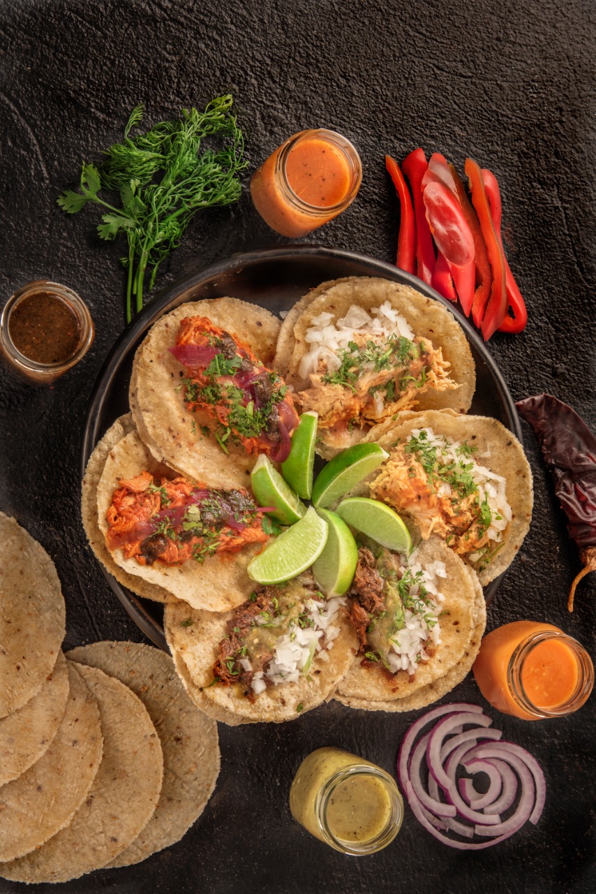 Esta orden de seis tacos tiene cochinilla pibil, barbacoa de res y tinga de pollo. La cochinita pibil es carne de cerdo que se cocina ocho horas a fuego lento en hojas de plátano; todo con tres salsas picantes.