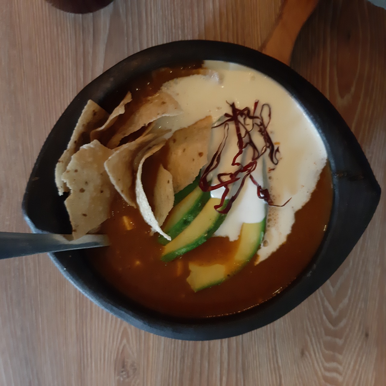 Esta sopa es una base de tomate con totopos, aguacate, crema de leche y chile huajillo que además se puede servir en una versión vegetariana o con adición de pollo desmechado para quienes lo deseen.