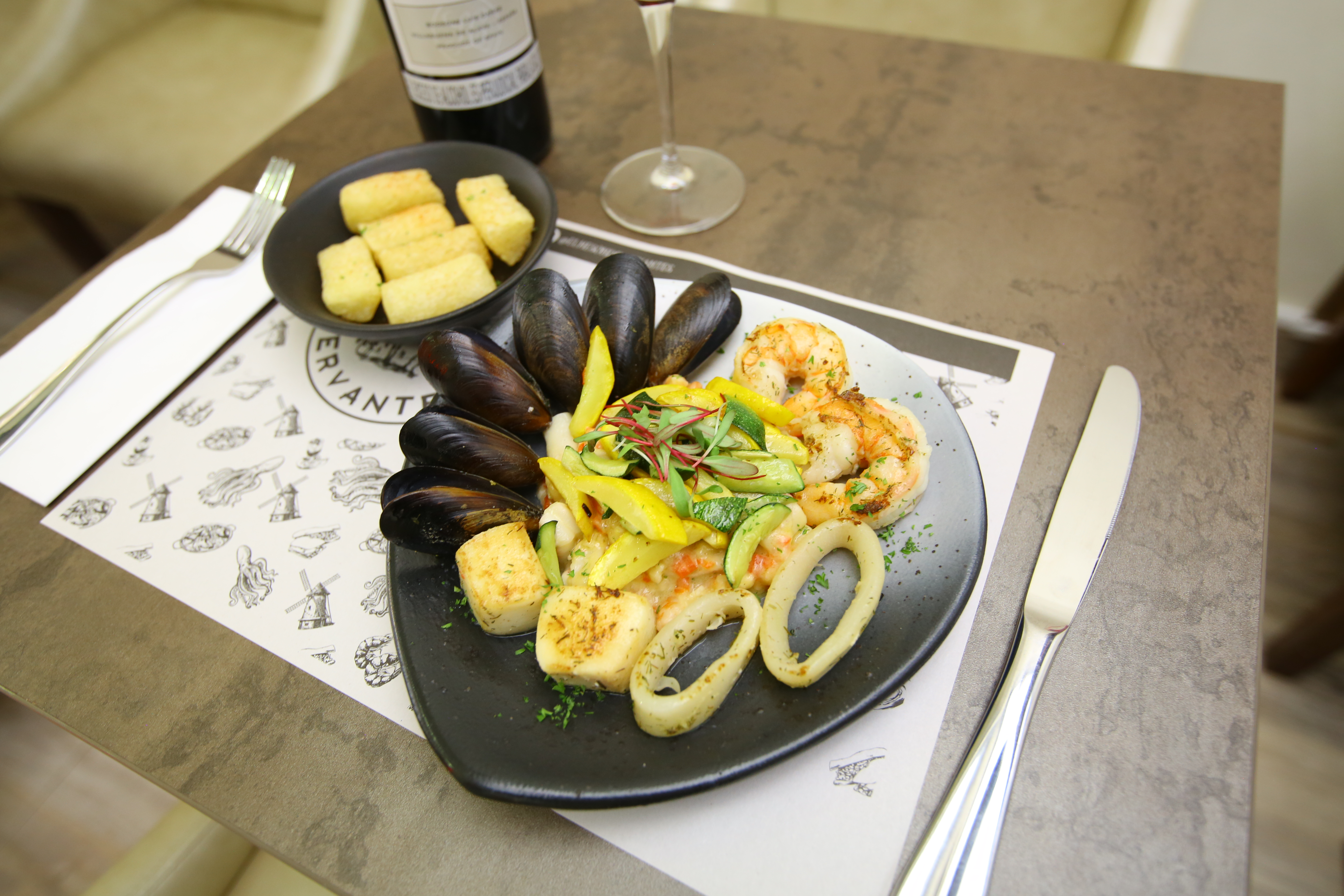 Sin embargo, en la carta del restaurante también se pueden encontrar platos tradicionales como la paella española mixta y el calamar relleno.