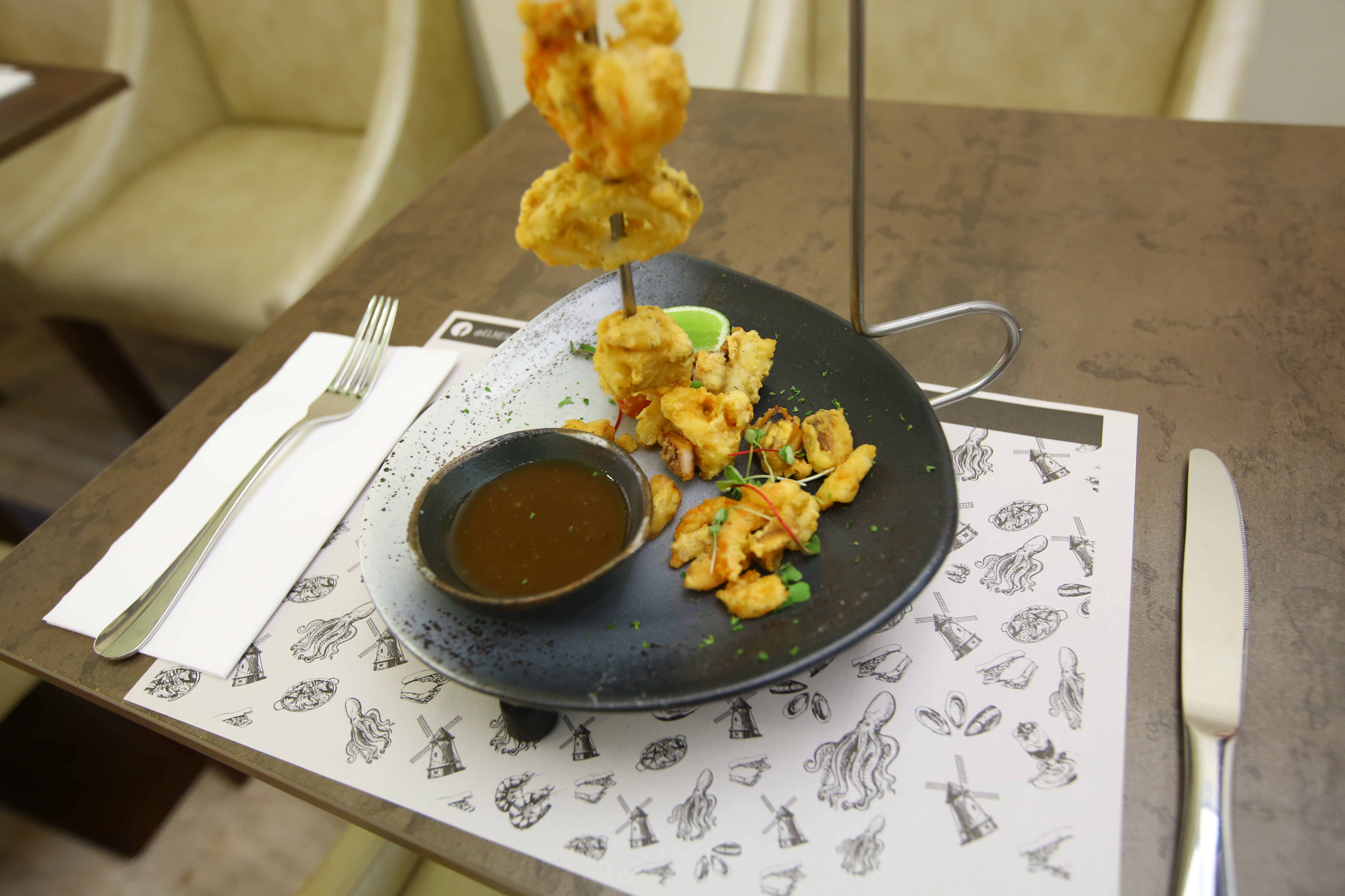 Pincho con langostinos, calamares y trozos de sepia acompañado de salsa de tamarindo.