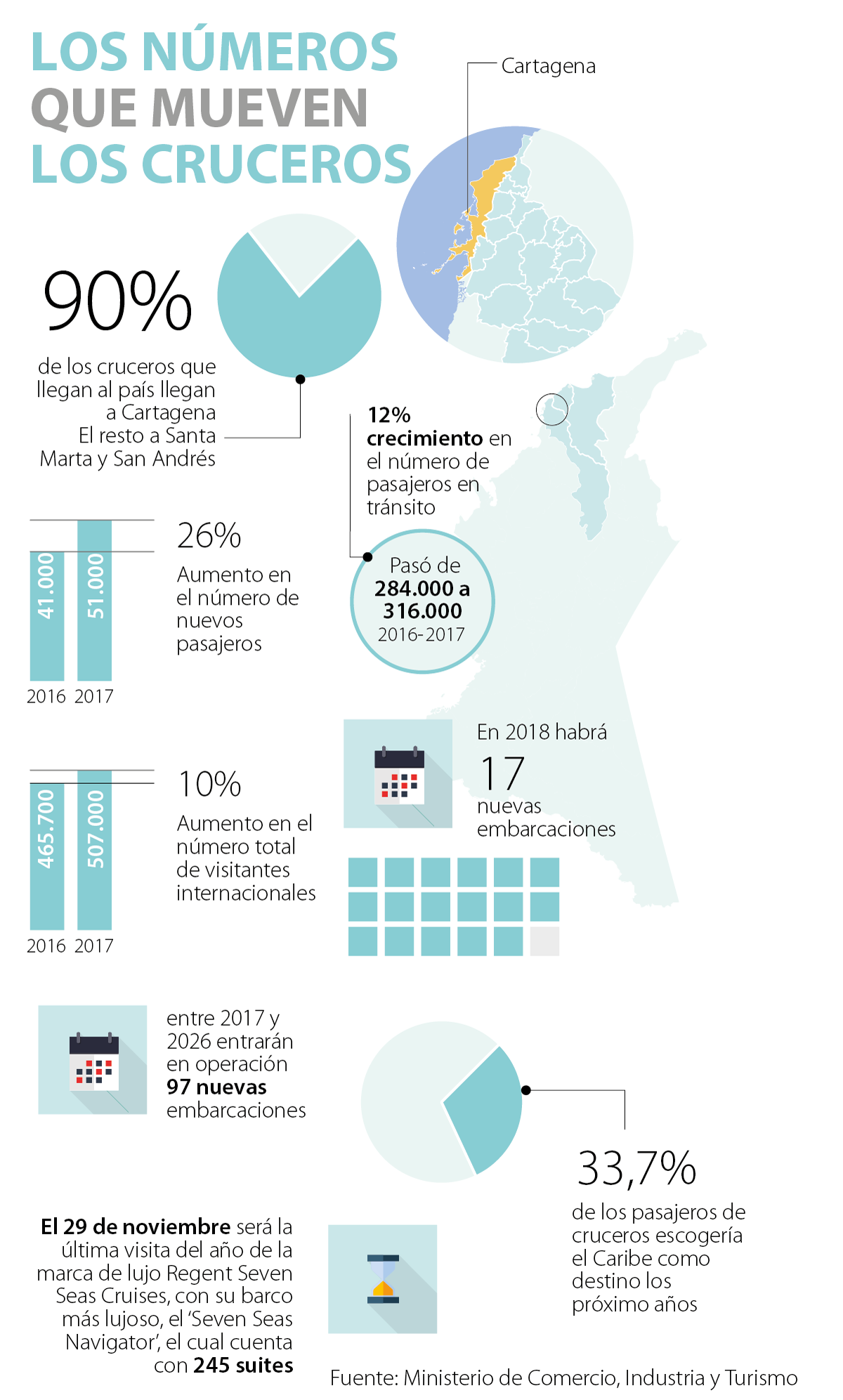 Según cifras del Ministerio de Comercio, Industria y Tursimo de Colombia (Mincit), en el primer semestre de 2017, comparado con el mismo período de 2010, aumentó en 17% el número de pasajeros que llegaron al país en cruceros, al pasar de 172.058 a 200.541 personas. Además, en el tema del arribo de barcos se pasó de 130 en 2010 a 132 en 2017, lo cual representa un crecimiento de 1,53%.