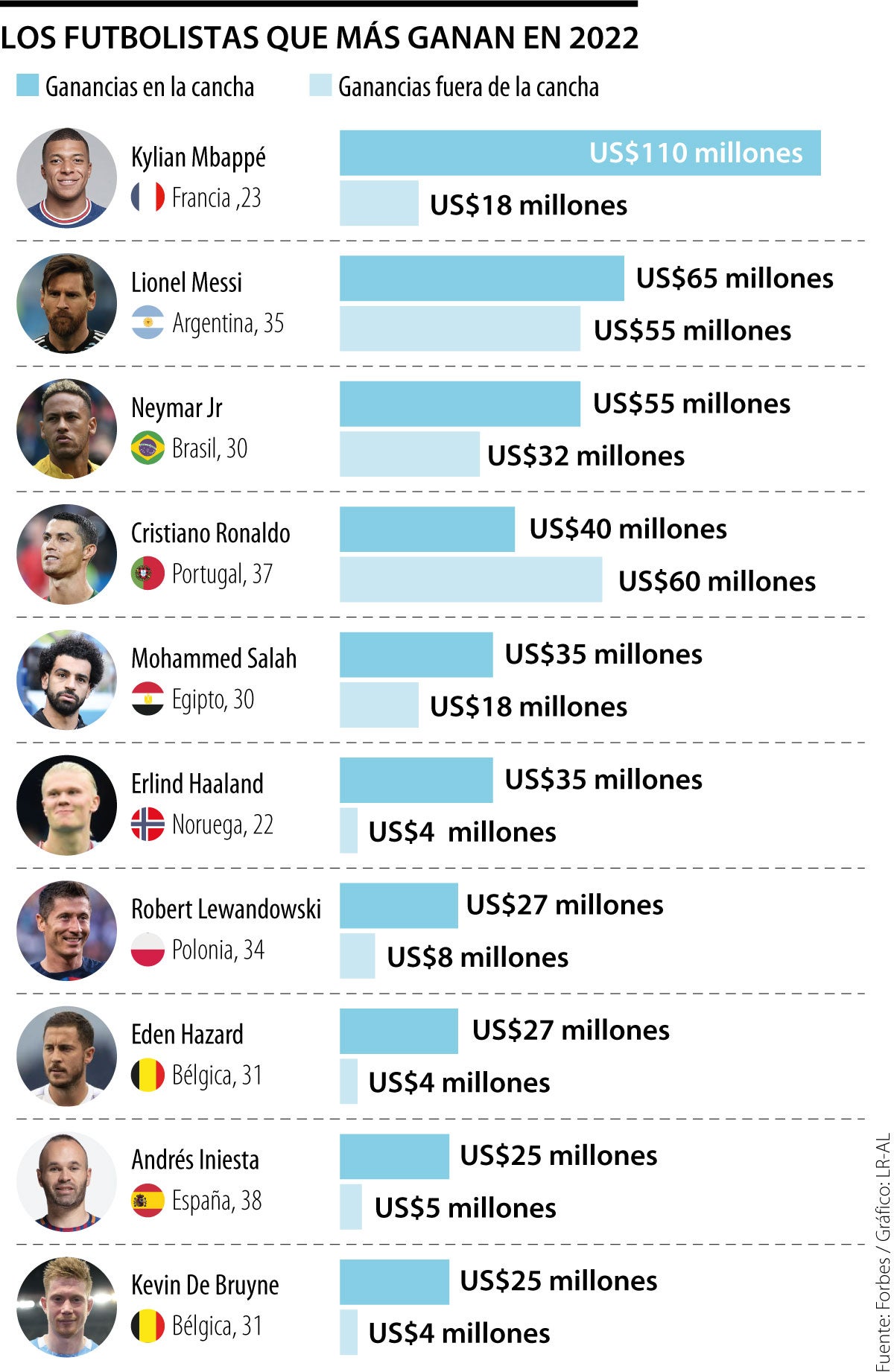 El cuarto puesto es para otro delantero del PSG: Neymar Jr, quien comandará a Brasil en la búsqueda de su sexto trofeo de la Copa del Mundo. El astro, ex Santos y Barcelona, devenga más de US$55 millones por su contrato con el equipo parisino y más de US$32 millones por su imagen deportiva.