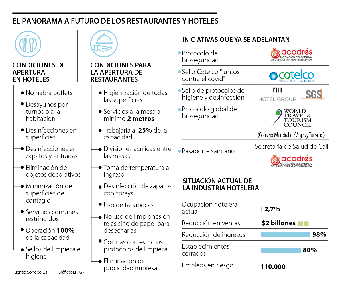 La industria hotelera y la de los restaurantes hoy trabaja a menos de media marcha, eso ha afectado los ingresos de miles de empresas, que en el caso de los hoteles se han visto reducciones de 98% en las ventas, equivalente a caídas de $1,2 billones mensuales, y para los restaurantes, las bajas de los ingresos llegan a 88%, frente a los datos que se registraban antes del covid.