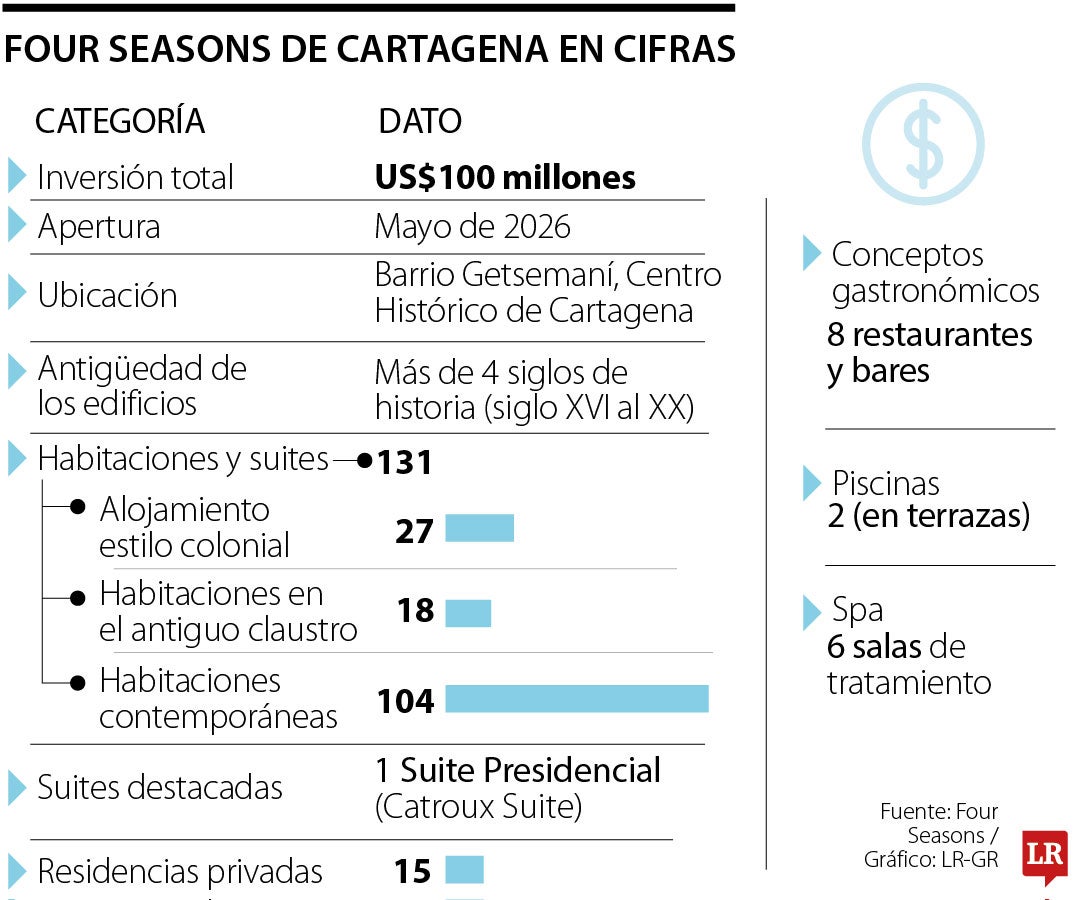 Con una inversión cercana a US$100 millones, Cartagena consolida su posicionamiento como destino internacional de turismo con la apertura del Four Seasons Hotel and Residences Cartagena, un proyecto que se levanta sobre más de cuatro siglos de historia arquitectónica y que representa una de las apuestas turísticas más ambiciosas del país. Se puede reservar a partir del 14 de mayo, cuando abrirá sus puertas al público.