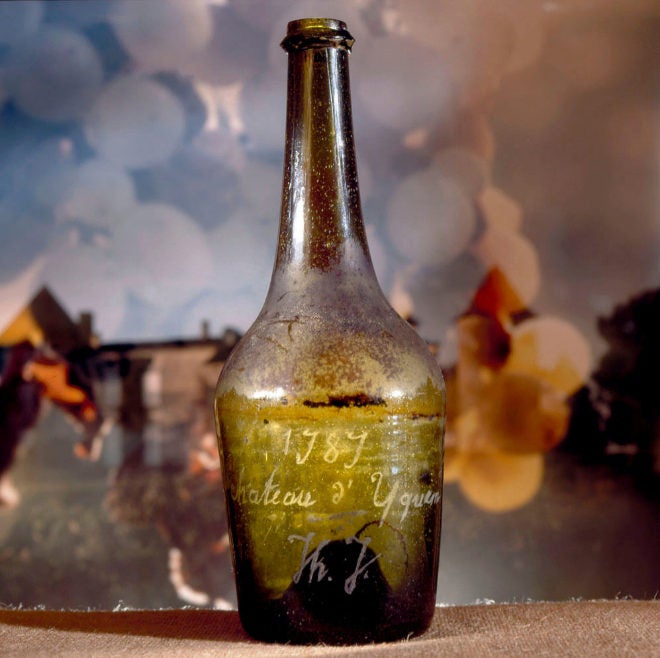 Ya se sabe que el célebre château de Pauillac, Burdeos, propiedad de la familia Rothschild, elabora uno de los mejores tintos del mundo. Pero esto no lo situaría entre los vinos más caros del mundo -y menos tratándose de una añada tan antigua: ¡vaya uno a saber cómo se encuentra el líquido en su interior!-, sino fuera porque por las iniciales grabadas en la botella -Th.J.- se intuye que la misma perteneció a la colección privada del tercer presidente de los Estados Unidos de América, Thomas Jefferson, además del principal autor de la Declaración de Independencia de ese país. Y gran amante del vino, entre otras cosas.