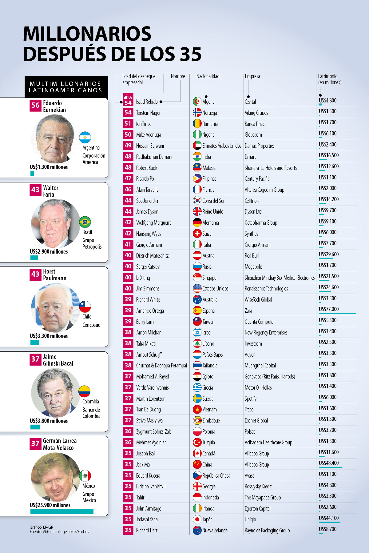 Un mapa global de las fortunas más fuertes hechas por empresarios y emprendedores arriba de 35 años.