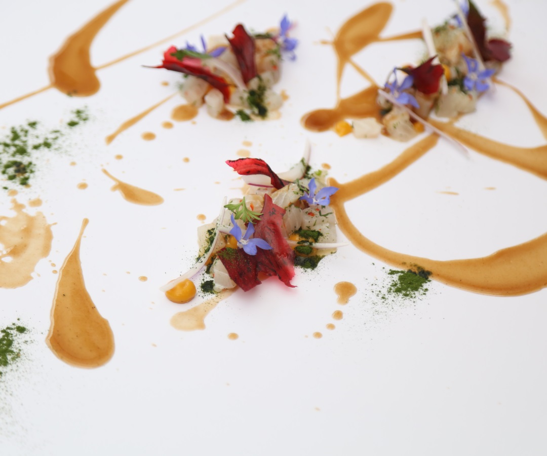 El ceviche está acompañado con leche de tigre de tamarindo y puré de chontaduro. También tiene crocantes de achiote y cebolla dulce, además de un polvo de cilantro y borrajas que decoran el plato.