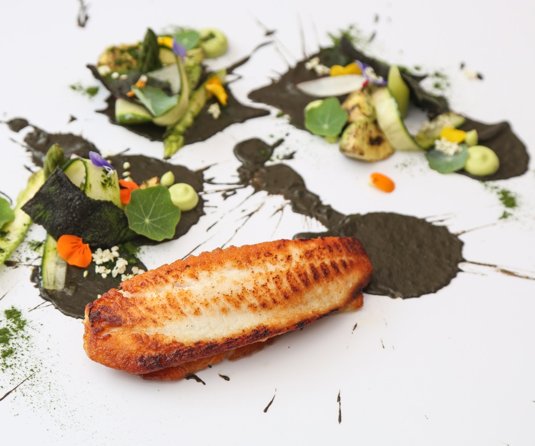 Junto con la porción de tilapia asada a la plancha, el plato viene acompañado de curry negro, aguacate quemado con puntos de emulsión del fruto, espárragos, zucchini en laminas, rábanos frescos, polvo de espinaca y hojas de capuchina.